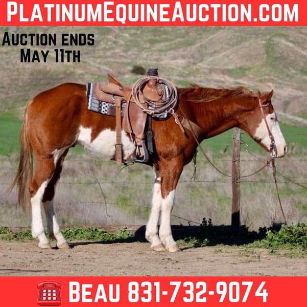 ONLINE AUCTION Place your bids at www.PlatinumEquineAuction.com Starting Bid $3500 Auction ends May 11th, 2025 Need a new saddle? Check out White Rock Saddles on our website or Facebook! Meet Big Jim, the laid-back legend of the horse world! This 7-year-old flashy paint gelding is not just a pretty face with his striking blue eyes; he’s a solid 15.1 hands of pure chill. If you’re after a horse that takes life at a leisurely pace, Big Jim is your guy. He’s all about cruising around the arena, showing off his smooth walk, trot, and lope, complete with a nice stop and a backup that would impress even the most seasoned cowboys. What’s truly remarkable about Big Jim is his easygoing nature. You could climb on him like a jungle gym, and he wouldn’t bat an eye at a waving flag, a bouncy ball, or even a tarp flapping about. He’s your trusty trail companion, ready to tackle hills, cross rushing streams, and navigate rough patches without breaking a sweat. He’s even done some cattle work checking fences and gathering. And let’s not forget his city skills! Big Jim has strutted through town like he owns the place, unfazed by honking cars or bustling crowds. He’s a dream for the farrier, doesn’t mind water, and is all current on his vaccinations. For more info or to chat about this gentle giant, reach out to Beau Mendala 831-732-9074. You won’t regret it! Located in King City, CA. ONLINE AUCTION Place your bids at www.PlatinumEquineAuction.com Starting Bid $3500 Auction ends May 11th, 2025 Need a new saddle? Check out White Rock Saddles on our website or Facebook!