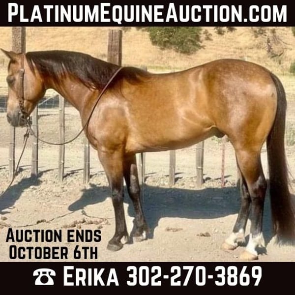 ONLINE AUCTION Place your bids at www.PlatinumEquineAuction.com Starting Bid $3500 Auction ends October 6th, 2024 Need a new saddle? Check out White Rock Saddles on our website or Facebook! Here is the buckskin horse of your dreams standing just under 14.2 HH and 7 years old. He is super friendly and a curious boy. He has the look of a show horse with his gorgeous frame, and long mane and tail. Aspen is super well behaved out on the trail, he will go out alone or with friends. He will cruise town with no nonsense. He has been used at some local shows for sorting and ranch trail. He handles the crowds and loud noises great doesn’t get bothered. Aspen has a lot of cow sense and is easy to gather and work pens on. He has a nice collected head set and lopes beautifully and correct circles. He has a stop to match and starting a nice turn around. This horse is very gentle and easy to handle, tacks up easy and rides right off. He has done amazing with the trail obstacles easy to show new things. He is great going over bridges, tarps, car wash and could care less about the flags. This boy will definitely catch everyone’s eyes with his dreamy color. He is safe and easy to handle and has been ridden from beginners to advanced riders. Aspen will be a great trail partner he loves to go out on adventures. He has been ridden english and His stylish moves are so comfortable you can ride all day. He will go through water, cross ditches, downed trees, navigate his way through brush and has seen tons of wildlife. He would make a lovely sorting or ranch riding companion. This boy can do it all he is a total gentlemen. Whether you want to dabble in the show pen or cruise the trails Aspen is ready and willing. He has a great friendly demeanor and is always waiting at the gate to meet you. He is current on vaccines, worming and farrier. Aspen rides bareback and in halter with confidence. He is a horse that does well with time off and retains his training. If you have any questions please contact Erika Paradee 302-270-3869 He is located in Woodside, CA. ONLINE AUCTION Place your bids at www.PlatinumEquineAuction.com Starting Bid $3500 Auction ends October 6th, 2024 Need a new saddle? Check out White Rock Saddles on our website or Facebook!