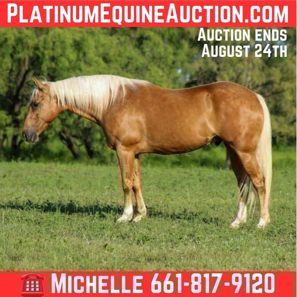 ONLINE AUCTION Place your bids at www.PlatinumEquineAuction.com Starting Bid $3500 Auction ends August 24th, 2025 Need a new saddle? Check out White Rock Saddles on our website or Facebook Have you been on the lookout for that perfect equine partner to share countless adventures with? Well, let me introduce you to the absolute star of the show—Bonanza! This stunning 8-year-old gelding stands at a lovely 14.3 hands and is quite possibly the prettiest blonde around! With a background that’s as diverse as they come, Bonanza has dabbled in everything from ranch work to miles of scenic trails, and he’s even spent long hours at the cow sale every week. Talk about a versatile guy! Bonanza is exceptionally well-trained. He’ll glide through perfect circles at the walk, trot, and lope in the arena, and he’s definitely got a bit of that “cowy” spirit—watch out cows, he’s the boss around here! But don’t let that cowboy demeanor fool you; he’s just as happy to take a leisurely stroll down the trail, making memories with his rider. This sweet boy is safe and suitable for anyone—grandma, grandpa, mom, dad, and the kids can all enjoy riding him! Trustworthiness is his middle name; he always gives his best when asked. We’ve worked cattle with him without a bridle and even ridden him bareback—all while he shows off his impressive skills. If you’re searching for a lovey-dovey type horse who adores being spoiled, Bonanza is your guy! He’s the kind of ranch horse that thrives on affection. No matter where you point him, he’ll go—right down the highway, past those big semi trucks, or even to the famous historical Fort Stockyards on a bustling Saturday. His calm, confident attitude makes him a true seasoned veteran in any situation! Bonanza is also a pro at side passing to open and close gates, crossing water and bridges, and even carrying flags. There’s truly nothing this guy can’t handle! He’s a unicorn in the horse world, and I could go on and on about how perfect he is. Trust me, Bonanza is just that special! If you’re ready to add this incredible companion to your family, don’t hesitate to reach out! He is UTD on everything just got his teeth floated, new shoes, vaccines and worming. You won’t have to worry about getting anything done just take him out and enjoy him. We are open to anyone interested in him to schedule a time to come see him or if you can’t make it schedule a FaceTime showing to see him. If you need help with transport don’t hesitate to ask we have a list of reputable haulers that can get him safely to your doorstep WORLD WIDE including, Alaska , Mexico, Hawaii, Canada and anywhere in between from Stephenville, TX. For more info contact M$ Performance Horses Michelle 661-817-9120. ONLINE AUCTION Place your bids at www.PlatinumEquineAuction.com Starting Bid $3500 Auction ends August 24th, 2025 Need a new saddle? Check out White Rock Saddles on our website or Facebook