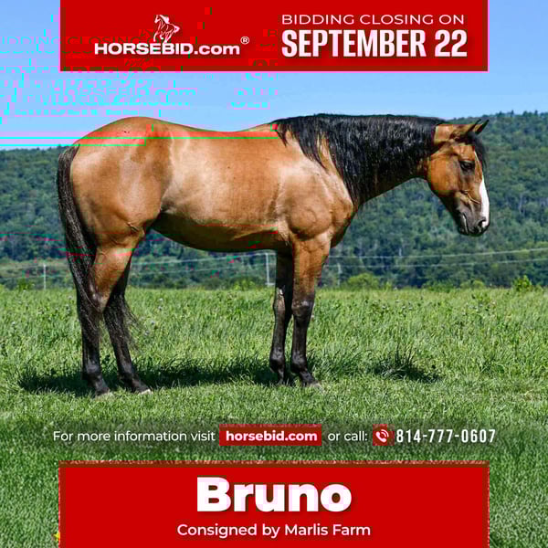 🍁𝒕𝒉𝒆 𝐅𝐀𝐋𝐋 𝑺𝒑𝒆𝒄𝒕𝒂𝒄𝒖𝒍𝒂𝒓🍁 Happening now thru MONDAY | SEPTEMBER 22nd - Available EXCLUSIVELY on HorseBid's website! For more details and to register visit: www.Horsebid.com CONSIGNOR CONTACT: Marlis Farm 814-777-0607 LOCATION: Rebersburg, PA BREED: Quarter horse REGISTERED: No COLOR: Dun HEIGHT: 14.3 AGE: 8 GENDER: Gelding Bruno as we call him is an 8yr old 14.3 hand dun quarter horse gelding that is well trained and fun to have around, he is a seasoned trail horse he will go over logs and through water and wherever you point him. Bruno rides well inside the arena and outside. He has a smooth walk trot and canter and picks up both his leads. He is soft in the bridle and has a big stop. We have taken Bruno down the main highway into town, and he dont mind all the traffic! Bruno is laid back and rides the same everyday whether you ride him daily or once a month ,he does not easily get excited making him the perfect choice for a leisure afternoon trail ride . We have used Bruno to chase cattle and check fences. We have exposed him to tarps, bouncy balls and all kinds of obstacles, and he takes it all like a walk in the park. Bruno is quiet enough for my boys to brush and lead around the barn yard and also ride him in the arena. Bruno rides english, and also takes a jump and enjoys every minute of it. He stands to be tacked and mounted, and to be bathed and stands for the farrier. Bruno does well inside and turned out in a mixed herd. He loves attention and is the first one to meet you at the gate. We have taken Bruno to national parks for day rides, and he doesnt mind all the bikes, dogs and commotion. Bruno sells sane, sound and ready to move into his forever home . For more info or to come meet him in person, feel free to call Mark 814 777 0607 We can help arrange shipping anywhere!!