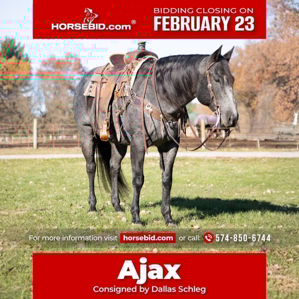 💎 𝐓𝐇𝐄 𝓓𝓲𝓪𝓶𝓸𝓷𝓭 𝐒𝐇𝐎𝐖𝐂𝐀𝐒𝐄 💎 Happening now thru MONDAY | FEBRUARY 23rd - Available EXCLUSIVELY on HorseBid's website! For more details and to register visit: www.Horsebid.com CONSIGNOR CONTACT: Dallas Schleg 574-850-6744 LOCATION: North Judson, IN BREED: AQHA REGISTERED: Yes REGISTERED NAME: FIRE BREATH N DASH COLOR: Blue roan HEIGHT: 15.3 AGE: 9 GENDER: Gelding Ajax ( FIRE BREATH N SMOKE) is a 2017 AQHA gelding. He stands 15.3 and is 1250 +! His size does not diminish his movement however and Ajax has an amazing handle to go with his stunning appearance! Ajax has been hauled all over to rodeos, trail riding, clinics, and play days! He has a decent turn around, a good side pass, lopes out of his tracks in either lead, And not a bad lead change either! He is formally trained to run barrels, but do not think he is some fire breathing dragon that is uncontrollable or sour. He is level headed and BROKE! We’ve used Ajax to pony colts, turn back buffalo, and rope cows! He crosses water, bridges, and logs with confidence. Ajax also loads, bathes, ties, and is good for the farrier! He is %100 sound and is currently barefoot. If you have any more questions or would like to come check him out in person do not hesitate to call me at 5748506744 for more questions!