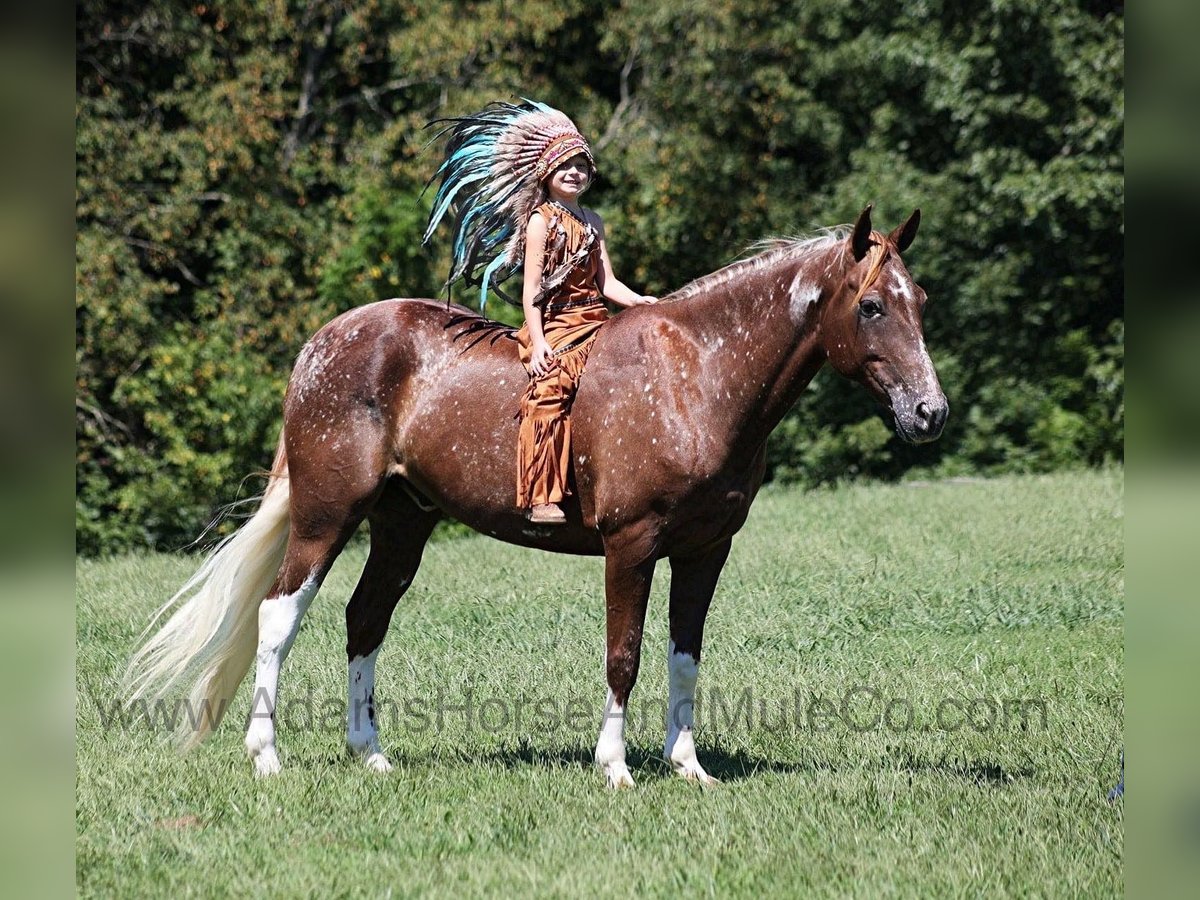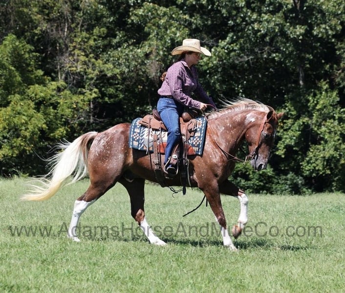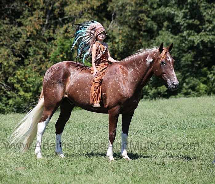 Go to www.AdamsHorseAndMuleCo.com for more pics and a video. AHAMC has been in the horse business and sold horses over the internet since 2005. We have a long track record of success with hundreds of happy customers. We work hard to match riders with the correct horses and specialize in beginner safe, family friendly horses that have been used and checked out by our family! I’ll bet you have not seen many like Astro before? Astro is an appaloosa paint gelding with snowflake spots all over with 4 big stockings and a white tail. He is standing around 15h and is 7 years old. He is friendly with lots of personality! Astro is a horse that the whole family can ride and enjoy! He has been ridden down the highways and he is traffic safe as well. Astro is great on trails and he will cross creeks, ditches, logs and navigate rough rocky areas. He has a smooth jog, a nice easy to set lope, a good stop, turns several circles both ways and backs with ease! He has been exposed to all kinds of wildlife such as deer or turkey or other animals like cows or dogs and will go anywhere that he is asked too. He has been rode many miles in the mountains of Eastern Kentucky and encountered every obstacle possible on the trail. He will go up or down even the steepest slopes, across deep creeks, over downed trees, and over all types of rough terrain while still being sure footed. Astro is not cinchy, cold backed, does not crib or weave. Astro is a once in a lifetime type of horse!!! Feel free to call Eric 606-308-2461 with any questions.