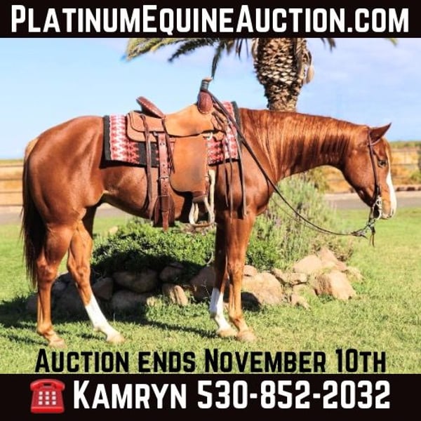 ONLINE AUCTION Place your bids at www.PlatinumEquineAuction.com Starting Bid $3500 Auction ends November 10th, 2024 Need a new saddle? Check out White Rock Saddles on our website or Facebook! Meet Bandito, a stunning 7-year-old, 15-hand copper red gelding that is as versatile as he is beautiful. This boy is the total package—a smooth and elegant mover with an adventurous spirit that will take you anywhere you want to go. With his graceful movement and fluidity, Bandito is a horse who turns heads whether on the trail or in the show ring. Bandito is an experienced trail horse who’s always up for an adventure. He’s proven himself time and again on all types of terrain, tackling water crossings, bridges, logs, steep hills, and rocky paths with confidence and ease. He’s a steady and reliable partner through it all, keeping his cool no matter what obstacles come his way. Whether you’re planning a quiet ride through the woods or exploring new, rugged terrain, Bandito will get you there smoothly. Bandito isn’t just a trail horse—he’s also well-versed in arena work. He knows his leads, has a solid stop, backs up, side passes, spins, and moves like a true professional. His fluid gaits make him a dream to ride. Bandito is no stranger to obstacles and challenges, whether it’s on the trail or in the arena. He’s confidently handled everything from water, logs, and uneven terrain to man-made obstacles like gates, tarps, and more. His laid-back nature extends beyond the trails—Bandito is used to loud noises, smoke, wildlife, dogs, tractors, ATVs, and heavy equipment. He’s also been rode around town and in parades through the whole city life. He’s the kind of horse that keeps his cool even in chaotic environments, making him an ideal companion for riders who encounter a lot of external distractions. At just 7 years old, Bandito is still young with plenty of potential left to explore. His versatility means he could go in any direction you want, whether that’s continuing as an exceptional trail horse or moving into more specialized disciplines like ranch work, roping, barrels/poles, jumping, or competitive trail riding. Because of his young age and with his responsiveness Bandito would thrive best in a more intermediate home. He stands tied for baths, saddling, farrier, grooming. He loads in the trailer well. He is UTD on teeth,shots,worming, shoes. Don’t miss out on Bandito the copper penny. Please contact Kamryn at KW Ranch 530-852-2032 Located in Pleasant Grove, CA. ONLINE AUCTION Place your bids at www.PlatinumEquineAuction.com Starting Bid $3500 Auction ends November 10th, 2024 Need a new saddle? Check out White Rock Saddles on our website or Facebook!