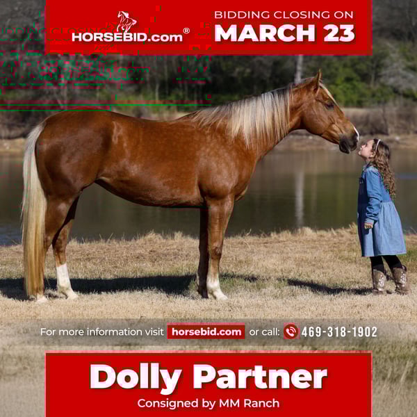 ⚜️𝓽𝓱𝓮 𝐆𝐎𝐋𝐃 𝓢𝓮𝓵𝓮𝓬𝓽⚜️ Happening now thru MONDAY | MARCH 23rd - Available EXCLUSIVELY on HorseBid's website! For more details and to register visit: www.Horsebid.com CONSIGNOR CONTACT: MM Ranch 469-318-1902 LOCATION: Forney, TX BREED: AQHA REGISTERED: Yes REGISTERED NAME: KATIE ROSE BY LL COLOR: Palomino HEIGHT: 15.1 AGE: 9 GENDER: Mare 🎤👱🏻♀️This is our dear sweet “Dolly Partner”!!! Yes we know Dolly Parton but it’s not to be confused with our sweet Dolly Partner!! (My 4 year old niece absolutely loves Dolly Parton but thinks her name is Dolly Partner cause she is a cowgirl!! I mean it makes sense. So it stuck and here is Dolly Partner. It’s the cutest thing ever to hear call her that. She loves her Dolly Partner.) 🎼👱🏻♀️Our sweet Dolly Partner is worthy of the superstar name cause she is truly ONCE IN A LIFETIME SUPERSTAR!! Absolutely worth her weight in gold!! 🌟 She is a AQHA registered stunning golden dappled palomino mare with the prettiest silver mane and tail. She is just 9 yr old and stands 15.1 hands tall. She is one of those impossible to find BOMBPROOF OLD FASHIONED FANCY BROKE ONES plus has the sweetest willing to please personality. She rides the very best. Of course she has all the fancy buttons to spin around and slide to a stop. But she will go as fast or as slow as you want her to go. She is the kind you can really enjoy riding and know you can’t screw up. She is ABSOLUTELY SAFE and BROKE for anyone to ride. If you can sit on her you can ride her no matter your riding level or age. I MEAN ANYONE CAN RIDE HER and ABSOLUTELY DO ANYTHING THEY WANT ON HER. You can ride her once a month a once a year and she is the same. You can catch her fresh out of the pasture and go. Dolly does not need to be tuned up or warmed up. Dolly stands perfect to be saddled and mounted. She will let you use a mounting block, fence, or bucket to get on and off. SHE DOES NOT HAVE ANY BAD HABITS OR QUIRKS. She is not scarred of anything, will not spook out on the trail. She will cross water, cross bridges, has been rode in every kind of terrain. She is the true definition of a bombproof safe for the whole family horse. We want to find Miss Partner an amazing home. This super sweet loving mares deserves it!!! 🎤👱🏻♀️She is a super easy keeper. Requires no maintenance of any kind. No special feed or supplements. She can go bare foot or put shoes on her. She has excellent hooves. She gets along great with other horses. She is not mean to other horses or marish. You can stall her or turn her out. Doesn’t matter to her. She sells 100% sounds with no issues. She did have a pre vet evaluation done included in the pictures. If you have anymore questions about her feel free to call. We would love to visit with you about her. We can help you arrange shipping anywhere. She is up to date on all vaccinations, worming, had her teeth checked, feet. She is ready to go to her new home to be loved and enjoyed. Don’t miss out on the one. These type amazing horses are sure hard to find.
