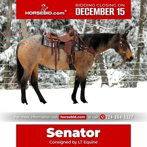 🎄𝐓𝐇𝐄 𝑯𝒐𝒍𝒊𝒅𝒂𝒚 𝐂𝐋𝐀𝐒𝐒𝐈𝐂🎄 Happening now thru MONDAY | DECEMBER 15th - Available EXCLUSIVELY on HorseBid's website! For more details and to register visit: www.Horsebid.com CONSIGNOR CONTACT: LT Equine 724-664-5327 LOCATION: Miola, PA BREED: AQHA REGISTERED: Yes REGISTERED NAME: Magic Senator COLOR: Buckskin Roan HEIGHT: 15.3 AGE: 8 GENDER: Gelding Introducing Senator! He is a registered AQHA gelding that is a very unique Buckskin Roan color. He is a nice tall thick built approximately 15.3 hands tall with nice legs and feet. Senator is a more whoa than go type horse that is a super solid trail horse! He will go out alone or in a group, lead or follow and goes wherever you point him, down thru the river up the steep hills and mud! I have had all level riders on Senator and he’s taken care of everyone! He has been rode English as well over ground poles and small cross rails! He had a nice easy one hand neck rein. Side passes and has a nice low level headset! His trot and lope are smooth and easy to sit! In the past Senator was a ranch horse where he roped and drug cattle. Here he is mostly a trail horse and weekend lesson horse. He will carry a flag and lope off with ease. Senator has a vet check that he passed with flying colors, new front shoes, and a fresh Coggins! For any more questions please call or text me at 724-664-5327, I can do FaceTime video if needed! We can also help arrange shipping. Thank you and have a wonderful day!