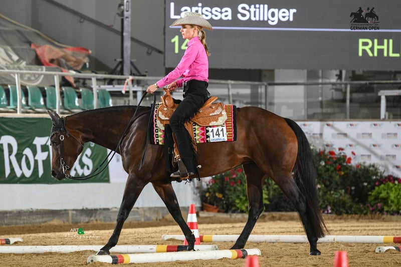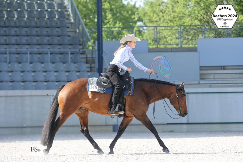 Zum Verkauf steht unsere Stute "GiveMeAllYourLuvin". Balis Pedigree lässt keine Wünsche offen. Ihr Vater "RL Best of Sudden" ist der All-Time AQHA und NSBA Leading Sire of Money Earned and Points Awarded in Western All Around Events. Ihre Mutter "Open Your Invitation" ist DQHA Leading Dam und hat viele erfolgreiche Nachkommen. Bali wurde 2016 bei David Maisonette in Frankreich geboren. Bali wurde 2- und 3-jährig erfolgreich in den In-Hand-Klassen geshowt. Sie wurde 2jährig Vize-Europameister in der Open und Amateur Halter sowie Q18 Futurity Reserve Champion in der Longe Line. 3jährig wurde sie Young Horse Cup Champion (Gesamtsiegerin der Showmanship, Trail in Hand und Longe Line) auf der EM und wurde auf der West Futurity Siegerin und Grand Champion Mare der Amateur und Open Halter, sowie Futurity Champion 3yo Mares und Longe Line. Ab 4jährig setzte Bali ihre sportliche Karriere unter dem Sattel fort. Sie wurde erfolgreich bei der EWU und AQHA/DQHA in verschiedenen Disziplinen geshowt: Trail, Showmanship, Pleasure, Horsemanship, Hunter, Hunt Seat, Ranch Riding und Halter. Neben vielen Platzierungen und Siegen, wurde sie AQHA All-Around Champion Amateur und Open, EWU Finalist in der Junior Pleasure und im Senior Trail, Bestes Jungpferd 6j Trail auf der Rheinlandmeisterschaft und qualifizierte sich zuverlässig für die German Open in der Pleasure, Trail, Showmanship und Horsemanship. Hervorzuheben ist, dass sie nicht nur von Profis und Amateuren geshowt wurde, sondern auch schon mit einer Jugendlichen erfolgreich lief und auch für die Führzügelklassen eine zuverlässige Partnerin war. Abseits der Turnierplätze hat Bali aber auch sehr viel Spaß an einem abwechslungsreichen Training: Ausritte, Cavaletti- und Dressurstunden, Horseagility, Bodenarbeit und Kursbesuche - sie macht einfach alles mit. Bali steht ganzjährig über Tag mit der Stutenherde auf der Wiese und nachts in der Box. Aktuell läuft sie barhuf, ist gegen Tetanus, Influenza, Herpes und West-Nil geimpft, die Zähne wurde kürzlich gemacht und sie wurde immer 3x jährlich entwurmt. Bei Interesse können Videos verschickt werden.