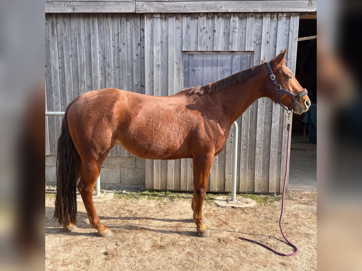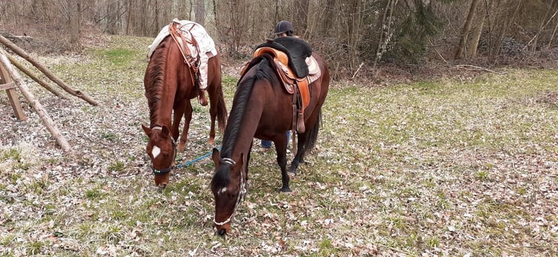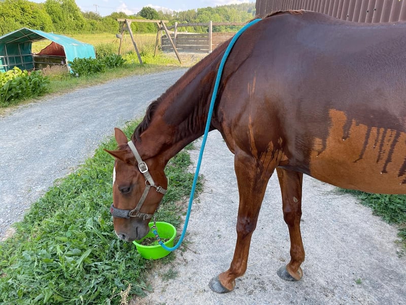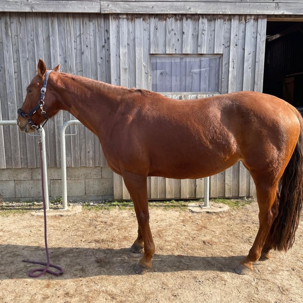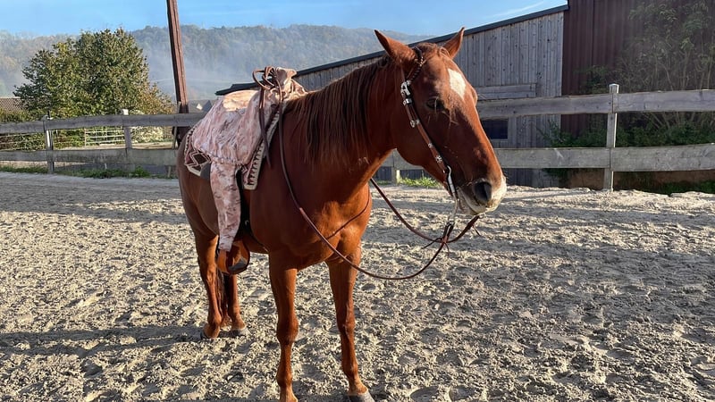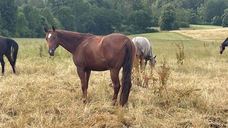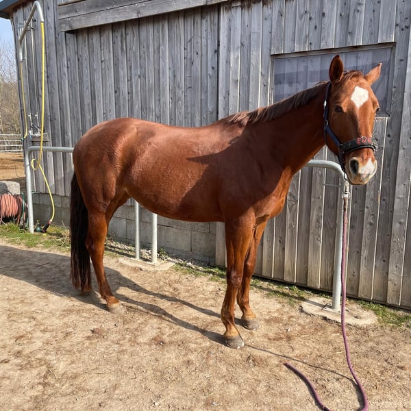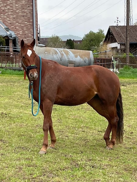 TFR A Blaze Of Glory ist eine bildhübsche, großrahmige und korrekt gebaute Quarter Horse Stute. Sie wurde im Januar 2016 geboren, ist chestnutfarben und hat ein Stockmaß von ca. 163 cm. "Eve" ist eine Stute mit einem ganz lieben Charakter. Sie ist sehr menschenbezogen, freundlich und neugierig und zeigt sich im täglichen Umgang stets unkompliziert und gelassen. Im Handling ist sie sehr brav und angenehm. Eve ist schmiede- und verladefromm, geimpft und regelmäßig entwurmt. Eve kennt sowohl Boxenhaltung mit Paddock und Weidegang als auch Offenstallhaltung und ist sehr sozial sowie herdenverträglich. Unter dem Sattel zeigt sie sich ruhig, brav und angenehm zu reiten. Sie verfügt über weiche, gute Gangarten und ist sehr bequem zu sitzen. Auch Reitfehler verzeiht sie, weshalb sie sich ebenfalls gut für Anfänger eignet. Gleichzeitig bringt sie viel Lernwillen und Talent mit und kann auch einem ambitionierten Reiter viel Freude bereiten. Sie ist fein an den Hilfen und gut ausgebildet. Eve besitzt eine sehr gute Westernausbildung und wurde kontinuierlich von Trainern gearbeitet sowie auf verschiedenen Kursen weiter gefördert. Sie wurde bereits erfolgreich in Ranch Riding, Ranch Rail, Trail, Pleasure und Horsemanship geshowt. Mit dem fliegenden Galoppwechsel wurde begonnen, dieser ist jedoch noch nicht vollständig sicher. Auch im Gelände zeigt sie sich stets ruhig und unkompliziert, selbst wenn sie alleine unterwegs ist. Bei ihr wurde 2020 als Zufallsbefund bei einer AKU Spat festgestellt, womit sie bisher jedoch keinerlei Einschränkungen oder Lahmheiten gezeigt hat. Röntgenbilder können selbstverständlich eingesehen werden. Im Jahr 2025 wurde zusätzlich auf beiden Vorderhufen ein Hufrollenbefund festgestellt. Daraufhin erhielt sie eine Stammzellentherapie, die sehr gut angeschlagen hat, sodass sie seitdem lahmfrei ist. Laut Tierarzt, Hufschmied und Trainer ist sie aktuell zu 100 % belastbar. Vorne läuft sie mit Spezialbeschlag, hinten barhuf. Diverse Röntgenbilder sowie eine AKU können eingesehen werden. Eve ist ein tolles Pferd für einen ambitionierten Reiter, der sich von ihrer Diagnose nicht abschrecken lässt und weiterhin mit ihr arbeiten möchte. Ob als Turnier- oder zuverlässiger Freizeitpartner - sie ist einfach ein liebes Pferd.