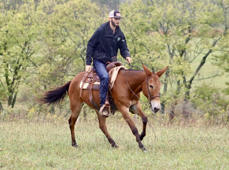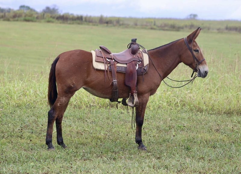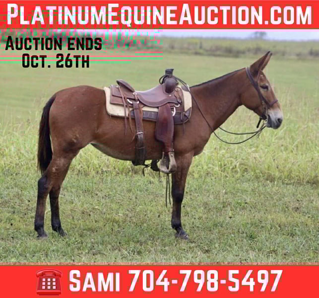 ONLINE AUCTION Place your bids at www.PlatinumEquineAuction.com Starting Bid $3500 Auction ends October 26th, 2025 Need a new saddle? Check out White Rock Saddles on our website or Facebook Hope is a 14.3 hand, 10 year old Molly mule. She is the mule you want to be riding when it comes time to gather cows, trail ride, or have a little fun in the area. She has 3 smooth gaits. Walk, jog, and lope. She has a slow jog on you can do a big ranch trot across the pasture if you want. She rides level headed and soft in the bridle. She rides one handed nicely. She is as sure footed as they come. It doesn’t matter how technical and rough the terrain is, she is going to get you through it safely. Hope will quietly and confidently walk into a set of cows whether it’s out in the pasture or in a catch pen. She has been roped off of. She is a trail riding machine and will take you anywhere you want to go. She is ready for fall trail riding or heading into hunting camp. She ties well either in the barn or on the high line. She is good with a group or rides out alone. Stands for clipping and the farrier. She is a friendly mule. She is the type of mule we are very proud to offer and know she will make someone an exceptional partner! For more information, please call/text Sammi with Waugh Livestock at 704-798-5497 Located in Brooksville, KY. ONLINE AUCTION Place your bids at www.PlatinumEquineAuction.com Starting Bid $3500 Auction ends October 26th, 2025 Need a new saddle? Check out White Rock Saddles on our website or Facebook