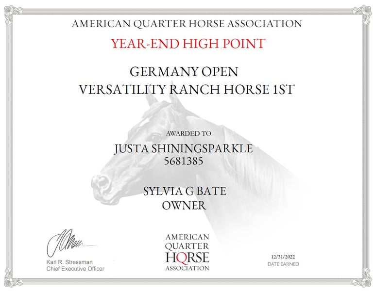 Exceptional Horse for Sale, Directly from the Breeder! Over €20,000 in Lifetime Earnings!!! Out of Sharp Dressed Shiner (Shining Spark) x Justa Little Slipper (Doc O’Lena x Freckles Playboy). Highly trained across all disciplines: multiple NCHA Cutting winner, multiple international NRCHA Reined Cow Horse Open Spectacular & Open Bridle champion, two-time AQHA European Champion Open Cow Horse, Reserve Champion Amateur, and winner of the Versatility Ranch Horse Series in both Open and Amateur divisions! Finalist at the 2023 Americana in Amateur Ranch Riding and Ranch Versatility! Just hop on, ride, and win! What more could you ask for? A wonderful, responsive mare, 1.52 m (15.1 hh), suitable for Non-Pro riders or young competitors, with a proven track record of international success in the Open division. For more information, please call 📞 +49 160 8444813 or email sylvia.bate@web.de. Price reflects the quality, asking €38,000. Videos available on YouTube (links): https://youtube.com/playlist?list=PLq8Y2gI-L2L4YbeEnS2a4kJn2wxSOXnVa&si=L-_V5yFPGdNy-B50 https://youtu.be/ZZtpMWX4c2A