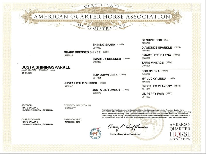 English text below... Ausnahmepferd steht wirklich zum Verkauf, direkt vom Züchter! Livetime earning über 20k ! ! ! Aus Sharp Dressed Shiner (Shining Spark) x Justa Little Slipper (Doc O’Lena x Freckles Playboy). Top ausgebildet in allen Bereichen: NCHA Cutting mehrfach gewonnen, NRCHA Reined Cow Horse Open Spectacular & Open Bridle international mehrfach gewonnen, 2 x AQHA European Champion Open Cow Horse & Res. Champ. Amateur, Versatility Ranch Horse Serie Open & Amateur gewonnen! Americana Finalistin Amateur Ranch Riding & Ranch Versatility 2023! Draufsitzen, losreiten, gewinnen! Was will man mehr! Tolle, fein zu reitende Stute, 1,52 Stm., für Non Pro oder auch Jugendliche sowie stets im Open Bereich international erfolgreich! Weitere Infos gerne unter 📞+49/160/8444813 oder per Email an sylvia.bate@web.de Preis der Qualität entsprechend, VB 38.000,- Videos unter youTube (link) https://youtube.com/playlist?list=PLq8Y2gI-L2L4YbeEnS2a4kJn2wxSOXnVa&si=L-_V5yFPGdNy-B50 https://youtu.be/ZZtpMWX4c2A CUTTING MARE / Versatility & Reined Cow Horse / American Quarter Horse! Exceptional horse for sale, directly from the breeder! Lifetime earnings over 20k!!! Out of Sharp Dressed Shiner (Shining Spark) x Justa Little Slipper (Doc O’Lena x Freckles Playboy). Top-trained in all disciplines: multiple NCHA Cutting winner, multiple international NRCHA Reined Cow Horse Open Spectacular & Open Bridle winner, 2 x AQHA European Champion Open Cow Horse & Reserve Champion Amateur, Versatility Ranch Horse Series Open & Amateur winner! Americana Finalist Amateur Ranch Riding & Ranch Versatility 2023! Just hop on, ride, and win! What more could you want! A fantastic, responsive mare, 1.52m (15.1hh), suitable for Non Pro’s or young riders, and consistently successful internationally in the Open division! For more information, call 📞+49/160/8444813 or email sylvia.bate@web.de. Price commensurate with quality, asking price €38,000. Videos See on YouTube (link) https://youtube.com/playlist?list=PLq8Y2gI-L2L4YbeEnS2a4kJn2wxSOXnVa&si=L-_V5yFPGdNy-B50 https://youtu.be/ZZtpMWX4c2A
