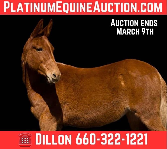 ONLINE AUCTION Place your bids at www.PlatinumEquineAuction.com Starting Bid $3500 Auction ends March 9th, 2025 Need a new saddle? Check out White Rock Saddles on our website or Facebook! Daisy is a 10 year old Molly mule. that will stand 14.3. Daisy has been drove single and double. Also broke to ride. With a more woah than go attitude makes her great to be around. she will walk trot and lope with no hesitation and is very smooth and fluent. From weekend camping trip to just wanting to go trail ride around the house. She will fit your every need. Daisy will stand tied and load with ease. And Will pick up all four feet. She is always the one who stands at the gate wanting a treat and a good pet. If you’re looking for a mule with a good demeanor daisy’s for you. For more questions please call Sunset S Equine 660-322-1221 Located in Carrollton, MO. ONLINE AUCTION Place your bids at www.PlatinumEquineAuction.com Starting Bid $3500 Auction ends March 9th, 2025 Need a new saddle? Check out White Rock Saddles on our website or Facebook!