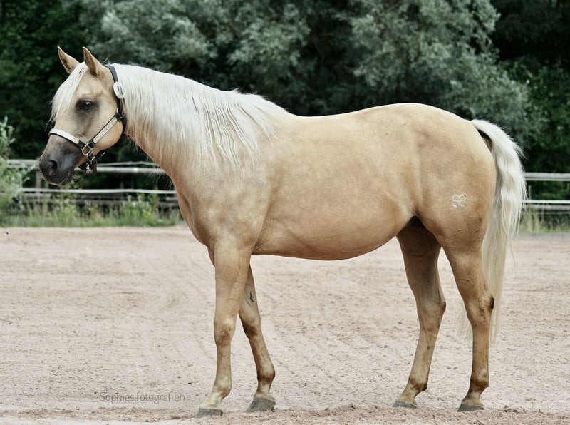 For sale is a beautiful American Quarter Horse mare, born in 2016. This elegant Palomino lady captivates with her impressive appearance and friendly nature. She currently has a sugar-sweet filly, Mugwort by Tarysmart. The two can also be purchased as a package. She is ideally suited for leisure and sport riders and impresses with her versatility and reliability. If you are interested, we look forward to hearing from you!