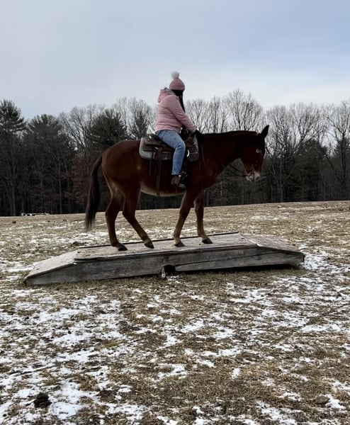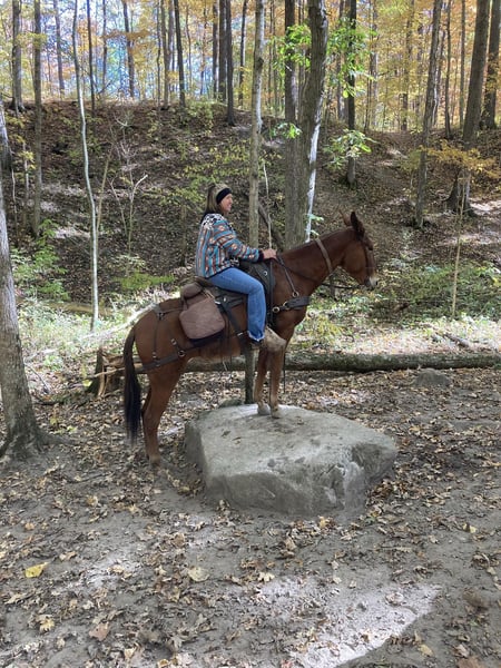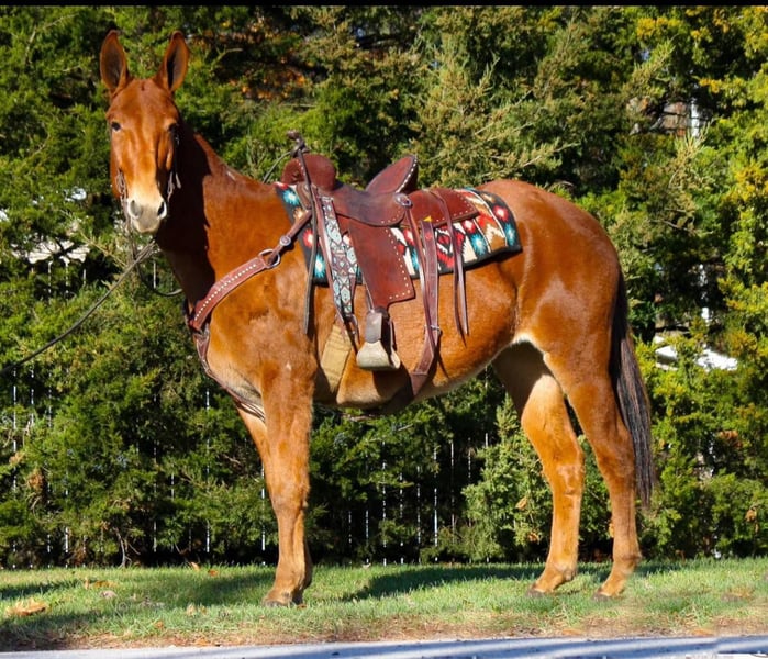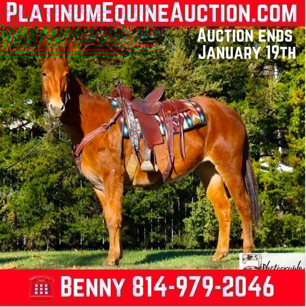 ONLINE AUCTION Place your bids at www.PlatinumEquineAuction.com Starting Bid $3500 Auction ends January 19th, 2025 Need a new saddle? Check out White Rock Saddles on our website or Facebook! Annie is a well-built sorrel molly mule standing around 15 hh, & she is 10 years young. She is very well broke mule that will back up, turn around, neck rein, lope & has a good stop. She is good with her ears, legs, tail, etc. I do not think this mule has a mean bone in her body. She stands to be clipped, bathed, & brushed. I have never seen her make a wrong move. Annie is always ready for her next adventure!! She’s kid tested & mother approved for husbands, grandmas, mamas, brothers, cousins, or your friends who have never seen a mule. She has been ridden around farm equipment, ATV’s, dogs, & you can shoot a gun on her. She is also broke to drive!! Absolutely no buck or spook!!! She’s been around cattle, roped on, & used in brandings. She will be the most honest trail riding mount you’ve ever swung your leg over. She has been ridden many miles in hills of Southern Indiana & Ohio. She has encountered every obstacle possible on the trail. She will go up or down even the steepest slopes, across deep creeks, over downed trees, & over all types of rough terrain while still being sure footed. We have ridden her down the road many times & she isn’t bother by any sort of vehicle that passes her. Our kids catch her, halter her, & lead her wherever they want to go. She’s one of the friendliest mules I have ever been around. She has a great attitude about whatever she is asked to do. One lucky person is about to get the love of their life with this gal!!! She could take someone in any direction: check your herd, any aspect of ranch life, coon hunting, cart rides, or just sightseeing on the trails. You can leave her turned out for months & catch her up & I promise she’ll be the same mule as she was when you turned her out. Located in Everett, PA. Contact Benny Hall 814-979-2046 with any questions. ONLINE AUCTION Place your bids at www.PlatinumEquineAuction.com Starting Bid $3500 Auction ends January 19th, 2025 Need a new saddle? Check out White Rock Saddles on our website or Facebook!
