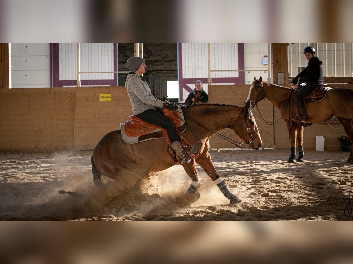 Quarter Horse Stute „Störni“ – Herz aus Gold, sicherer Partner & tolle Zuchtperspektive 11 Jahre | ca. 1,45 m | aktuell im Vollberitt | Standort: Fehrbellin Meine bezaubernde Quarter Horse Stute „Störni“ sucht aufgrund absoluten Zeitmangels ein neues Zuhause, in dem man ihr riesiges Herz, ihre Rittigkeit und ihre besondere Ausstrahlung genauso zu schätzen weiß, wie ich es tue. Trotz ihres kompakten Stockmaßes deckt sie hervorragend ab und vermittelt ein angenehmes, feines und stets sicheres Reitgefühl. Störni wurde vierjährig angeritten und überzeugt seither mit sauberen, ausdrucksstarken Manövern. Ob Halle, Platz oder Gelände – sie ist jederzeit motiviert, bemüht und zeigt sich im Gelände besonders sicher, nervenstark und macht einfach nur Spaß. Man sitzt auf ihr und fühlt sich sofort wohl. Auch auf dem Turnier ist sie eine echte Bank: cool, zuverlässig und souverän, egal welche Umgebung sie erwartet. 2023 hat sie ein wunderschönes Hengstfohlen zur Welt gebracht und sich dabei als liebevolle und instinktsichere Mutterstute bewiesen. Dank ihrer Abstammung bleibt sie auch weiterhin hochinteressant für die Zucht. Nach ihrer Babypause wurde sie behutsam wieder antrainiert und befindet sich aktuell im Vollberitt in Fehrbellin. Neben ihrer Leistungsbereitschaft hat Störni auch ein unglaublich liebes Wesen: Sie ist verschmust, menschenbezogen und genießt jede Aufmerksamkeit ihres Menschen. Betritt man das Paddock, weicht sie einem meist nicht mehr von der Seite ♥️ Optional kann ihr passendes Equipment (inkl. Gomeier-Sattel, 5-Star Pad, Bucas-Decken etc.) mit übernommen werden. Preis mit Equipment: 20.000 € VB Bilder und Videos sende ich bei ernsthaftem Interesse sehr gern zu.