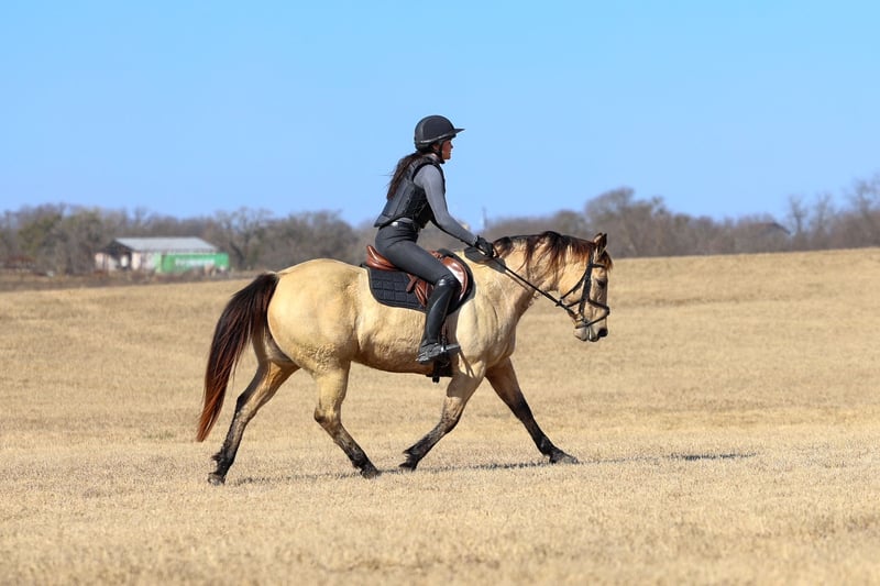 Sie hat einen kraftvollen Schritt, einen seidig-glatten Trab und einen traumhaften Galopp – alles auf losem Zügel oder sogar ohne Gebiss! Nicht aufdringlich oder fordernd, was sie zu einem großartigen Pferd für Anfänger macht, die Selbstvertrauen aufbauen möchten, oder als „Babysitter“, um sie an das Reiten heranzuführen. Sehr verzeihend und geduldig – sowohl am Boden als auch unter dem Sattel. Sie reitet auch englisch und wurde über Cross-Country-Kurse ausgebildet. Sie ist bereit für Shows und hat unendliches Potenzial zur Weiterentwicklung. Sie hat genug Kontrolle, um an lokalen Fun-Shows oder 4H teilzunehmen, und kann auch bei der Arbeit auf der Ranch eingesetzt werden.