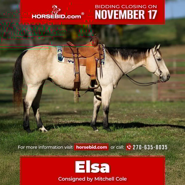 🎲𝓽𝓱𝓮 𝐑𝐈𝐃𝐄𝐑'𝐒 𝓒𝓱𝓸𝓲𝓬𝓮🎲 Happening now thru MONDAY | NOVEMBER 17th - Available EXCLUSIVELY on HorseBid's website! For more details and to register visit: www.Horsebid.com CONSIGNOR CONTACT: Mitchell Cole 270-635-8035 LOCATION: Madisonville Ky BREED: Quarter Horse REGISTERED: No REGISTERED NAME: Elsa COLOR: Buckskin HEIGHT: 14.3 AGE: 12 GENDER: Mare Elsa is a 12 year old buckskin mare standing a perfect 14.3 and is the definition of SAFE!! Outside, Elsa is the perfect trail partner! She has been exposed to everything and been trail ridden countless miles! She handles bridges, water, and all of the obstacles with zero issues! She is laid back, simple, and easy to ride! She will go where you point her! In the pasture Elsa has been used to gather cattle, as well as help sort and load cattle at the feed lot! Inside the arena Elsa rides one handed, and takes both leads with ease! She has been ridden in the arena by all ages! She clips, loads, and stands for the farrier, as well to be mounted perfectly! She has been exposed to traffic spending a day in town enjoying the attention. Nothing bothered Elsa! Cars, trains, or any of the fall decorations! Elsa is the perfect mare for someone wanting to just enjoy the ride! She sells 100% with ZERO vices! All PPE are welcome at the buyers expense! Trucking can also be arranged, stress free! For more information, or to come and try Elsa please contact me at (270) 635-8035
