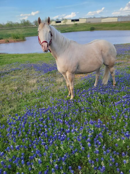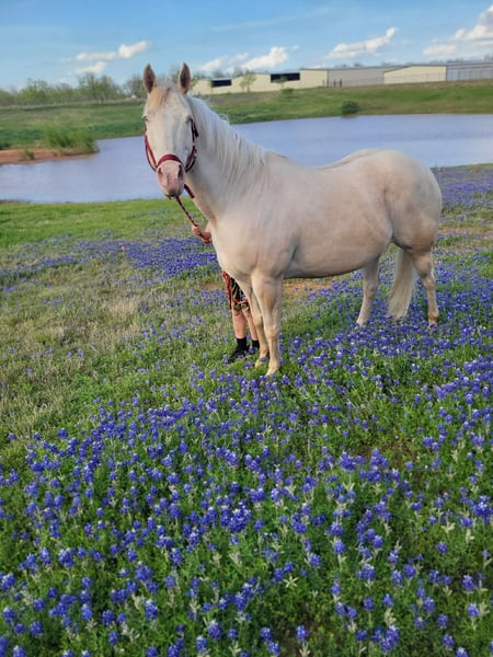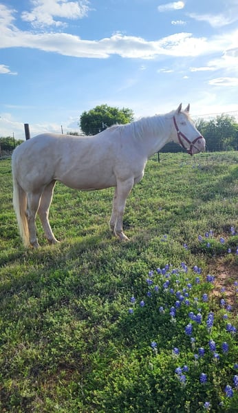 "AVAILABLE ON ONLINE HORSE AUCTION AT www DOT PlatinumEquineAuction DOT com BIDDING OPEN NOW thru SUNDAY | APRIL 26TH! *Final price will be determined on auction site* CONSIGNOR CONTACT INFO: Tina Haywood 817-559-4465 LOCATION: Grandbury, TX Tracy Of Memory Lane is a 12-year-old registered AQHA Cremello mare that is suitable for the whole family. She stands 15 hands tall and weighs approximately 1150 pounds. She has a lot of muscle and great confirmation. She has a beautiful halter head with short ears. She has a deep heart girth and a big hip, all four straight legs, and great hooves. Tracy‘s temperament is very docile and gentle. She is laid-back and sweet. Tracey loves attention. She has something for the whole family, she loves attention, and she meets you in the pasture. She is slow and confident for the little inexperienced ones and she is surefooted and very well broken for the experienced ones in the family. She has been shown in 4-H and has been ridden in parades during holidays. She has moved cattle on the farm and in the arena. Tracy is an excellent trail horse & has been ridden on big trail rides such as Palo Duro Canyon and Matzel’s game reserve. She is used to wildlife, trucks, tractors, skid loaders, and trains she has no spook or buck. She has no bad habits. Tracy stands like a statue to mount and dismount, whether it be from the ground or a mounting block. Tracy has no problems on trails with crossing water, ditches, logs or unlevel terrain. Her ground manners are impeccable. She is good with her feet. She hauls, clips, and bathes like a statue. Tracy is 100% sound in every way, whether it be riding or breeding if you’re looking for a total package for the whole family, Tracy is dependable, gentle, and surefooted. She’s also been used for lessons for multiple children and has also been used to pony other horses, truly sweet and sensible. Please contact Tina at 817-559-4465 for more information.