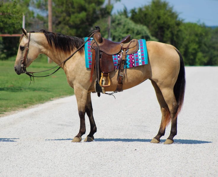 ONLINE AUCTION Place your bids at www.PlatinumEquineAuction.com Starting Bid $3500 Auction ends August 11th, 2024 Need a new saddle? Check out White Rock Saddles on our website or Facebook! They don’t come anymore perfect than this pretty little gal we’re about to Introduce you to ! Butters is a 12 year old buckskin mare standing 14 hds tall . Shes absolutely SAFE for any level rider and will be safe for anyone from 5 to 85 . We trust Butters with everyone ! Butters is the funniest gal to go cruise around on , she’s user friendly and you don’t have to be a cowboy to ride her . She is happy to do whatever you ask of her , she will go out down the trail by herself or in a group . She will cross water , logs , bridges and tarps and whatever else you may come across down the trail with zero hesitation. She is confident all while taking care of her riders . She is the perfect mount for everyone including the littles to enjoy from the trails to arena work . Butters is always a trooper when being rode in town with the heavy traffic , crowds of people and is always the first one to get loved on by everyone . She is the sweetest mare and loves attention always being the first one to greet you in the barn . In the arena she has smooth gaits and transitions . We have gave numerous lessons on her for all levels of riders , she is very forgiving and always try’s 100% to please. She will walk , trot and lope circles , she has a true neck rein on her , moves off of your legs. She is the perfect addition to anyone’s family and not only is she the perfect size she’s Americas favorite color ! She loads and unloads off the trailer great . Stands great to tack up and easy to bridle . Butters is also one you can jump on bareback with a halter and take out for a ride . She clips , ties , stands for the farrier and bathes like a dream. She is truly a unicorn that everyone searches the world for! Call us to schedule a time to come try her out or we can set up a FaceTime call. If you need help with transport don’t hesitate to ask we have a list of reputable haulers that can get her safely to your doorstep world wide. Contact M$ Perf. Horses Michelle 661-817-9120 with any questions. Located in Stephenville, TX. ONLINE AUCTION Place your bids at www.PlatinumEquineAuction.com Starting Bid $3500 Auction ends August 11th, 2024 Need a new saddle? Check out White Rock Saddles on our website or Facebook!