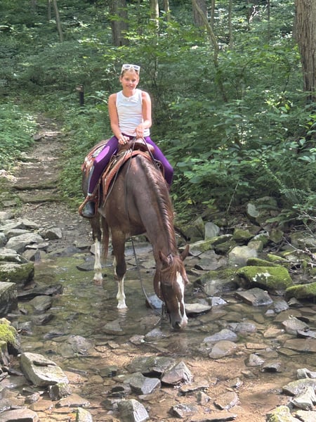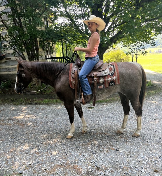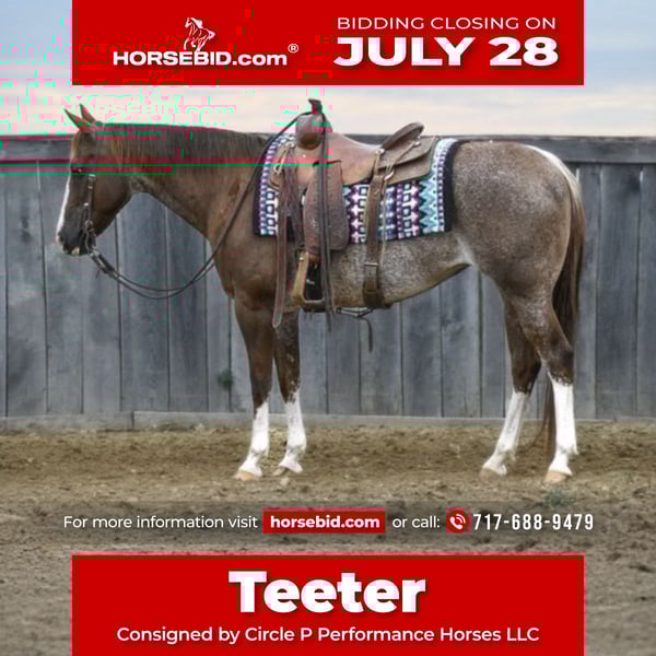 ⚔️ The HORSEMAN's Select ⚔️ Happening now thru MONDAY | JULY 28th - Available EXCLUSIVELY on HorseBid's website! For more details and to register visit: www.Horsebid.com CONSIGNOR CONTACT: Circle P Performance Horses LLC 717-688-9479 LOCATION: Littlestown, PA BREED: Quarter Horse REGISTERED: No COLOR: Rabicano HEIGHT: 14.1 AGE: 14 GENDER: Mare Smart Little Teeter aka “Teeter” is a flashy 14yr old, 14.1 hd Chestnut Quarter Horse mare with the coolest blaze and roan hairs all back through her. Teeter is extremely well broke with a nice turnaround, stop, sidepass and reverse. She has been successfully shown at the Ranch Sortings and in Ranch Pleasure and Ranch Trail. She’s also the best trail mount you could ever ask for! Teeter always goes down the trail low headed with a drape in the reins! Everything she does is with such precise style and class! She is very sure footed on the trail, crosses logs, streams, bridges with ease and is traffic safe! She is a true insurance policy! She would make a great addition for someone looking for a safe trail mount or a nice little horse for the kids to show in 4H! Teeter has impeccable ground manners, she stands tied anywhere, loads and hauls great, stands to be clipped, bathed, brushed and saddled and is excellent for the vet and farrier! If you’re looking for that enjoyable, safe ride or a trustworthy mount to teach your children, Teeter’s your gal! Teeter is UTD on shots, deworming, farrier and sells with a recent health exam! Coast to Coast shipping available. Please feel free to reach out with any questions or to set up a visit to meet Teeter!