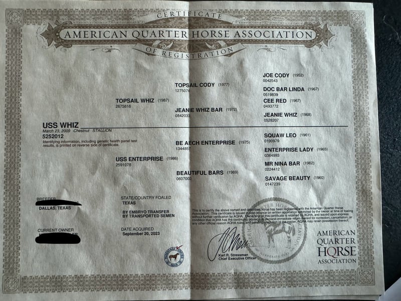 Te koop staat een drachtige Quarter Horse fokmerrie. Ze is 15 jaar oud en ongeveer 1,53 m hoog. Ze pikt goed op en heeft al meerdere prachtige, correct gebouwde veulens gehad. Ze is drachtig van USS Whiz, een directe nakomeling van Topsail Whiz. Ze is in de omgang zeer braaf en makkelijk, ook met veulens is ze perfect. Ze laat zich goed laden en is ook braaf bij de hoefsmid. Ze heeft waarschijnlijk artrose aan de voorbenen en wordt daarom alleen verkocht als fokmerrie of bijstal. Eerder is ze ook bereden geweest. Bij ons is ze altijd alleen als fokmerrie gebruikt. Vraagprijs bespreekbaar. We hebben nog meer drachtige merries, veulens en mogelijk ook een dekhengst. Graag bellen of een bericht sturen naar 0157 36803742. Alle informatie is zonder garantie, prijswijzigingen voorbehouden, transport mogelijk, online aankoop mogelijk.