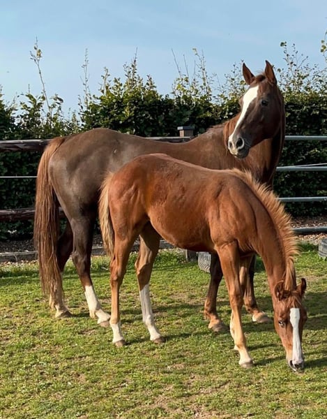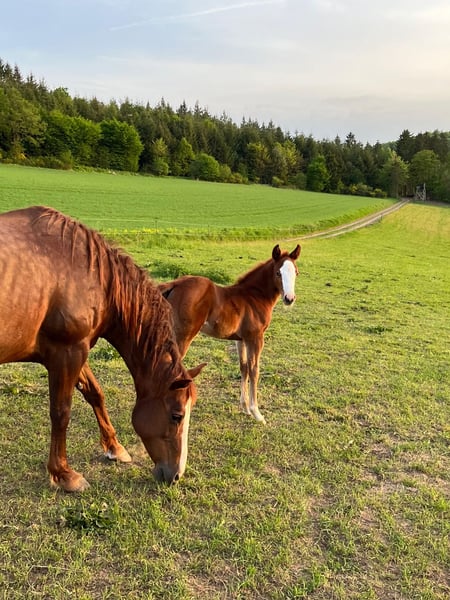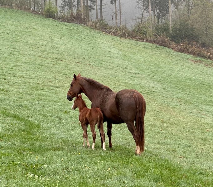 For sale is a broodmare Quarter Horse mare. She is 15 years old and approximately 15.3 hands tall. She adapts well and has already produced several very beautiful, correctly conformed foals. She is currently pregnant by USS Whiz, a direct descendant of Topsail Whiz. She is very well-behaved and easy to handle, even with foals, and is an absolute top in this regard. She loads well and is also calm at the blacksmith. She likely has arthritis in her front legs and is therefore sold only as a broodmare or companion horse. She was ridden in the past, but here she has only been used for breeding. Price negotiable. We also have other pregnant mares, foals, and possibly a breeding stallion available. Feel free to call or send a message at 0157 36803742. All information provided is without guarantee. Price is subject to change. Transport and online purchase options available.
