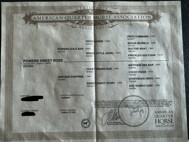Na sprzedaż wystawiamy ciężarną klacz rasy Quarter Horse. Klacz ma 15 lat i około 153 cm wzrostu. Dobrze się aklimatyzuje i wydała już kilka bardzo ładnych, poprawnie zbudowanych źrebiąt. Jest w ciąży z USS Whiz, bezpośrednim potomkiem Topsail Whiz. Jest absolutnie spokojna i łatwa w obsłudze, także w towarzystwie źrebiąt, co czyni ją idealną do hodowli. Łatwo się załadowuje do transportu i jest spokojna podczas czyszczenia kopyt. Prawdopodobnie ma artrozę w przednich nogach, dlatego sprzedawana jest wyłącznie jako klacz hodowlana lub konik towarzyszący. W przeszłości jeźdzono na niej także rekreacyjnie. U nas służyła wyłącznie jako klacz hodowlana. Cena do negocjacji. Posiadamy również inne ciężarne klacze, źrebięta oraz ewentualnie ogiera reprodukcyjnego. Zapraszamy do kontaktu telefonicznego lub wiadomości: 0157 36803742. Wszystkie informacje podane bez gwarancji, zastrzegamy sobie prawo do zmiany cen, możliwy transport, zakup online.
