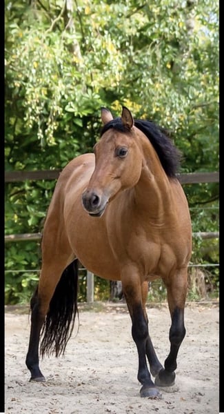 Beautiful mare seeking a new home. She had a few foals before my time and was originally kept at Merzig Hofgut Berg for many years. With us, she has been used for relaxed trail rides, which she handles very well. Year of birth: 2010 Sire: Hollywood Dun It Laboklin tested and clear Height: approximately 154 cm Color: Buckskin (Dun) Good qualities: no biting, no kicking, easy to handle for the farrier, very calm, never spooks at people, never pushes. Thick mane and tail. Suitable for guided walks with small children. Less good qualities: dust allergy, deworming only with a special method, sometimes needs a gentle reminder when gathering her in the evening. In the stable, she needs moist or steamed hay, otherwise she coughs. No problem with round bales in the paddock. Last year, she was at Lutz Lekebusch for a 4-week refresher. I can easily imagine her as a mother/daughter team or for older riders for leisurely rides, or as a broodmare. There are two geldings that look like her. Interested parties are welcome to arrange a pre-purchase examination (AKU). A co-ownership or breeding agreement will be included in the contract. Please read carefully and provide your name and phone number when inquiring. Priority goes to the best offer.