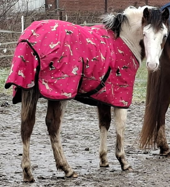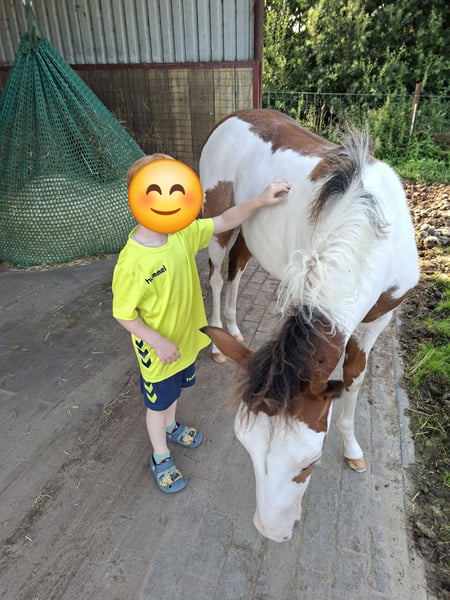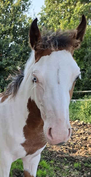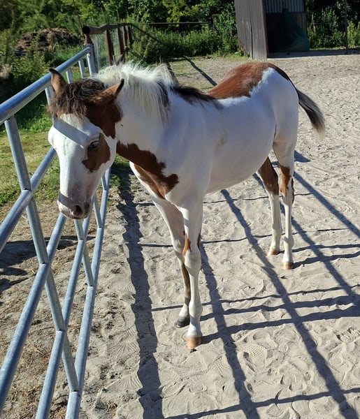 Zum Verkauf steht eine gesunde, aufgeweckte Scheckstute, geboren 04/25 Die Stute besticht durch ihren kompakten. korrekten Körperbau und viel "Lady Charme"