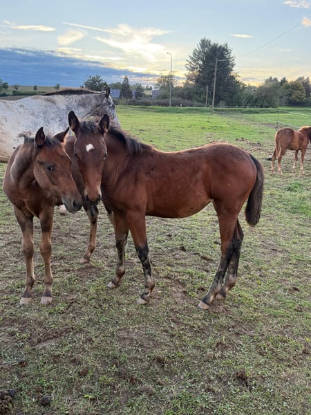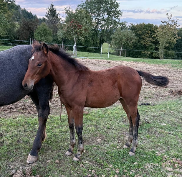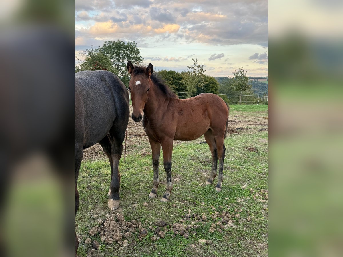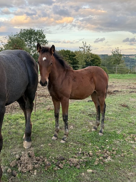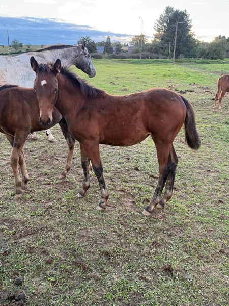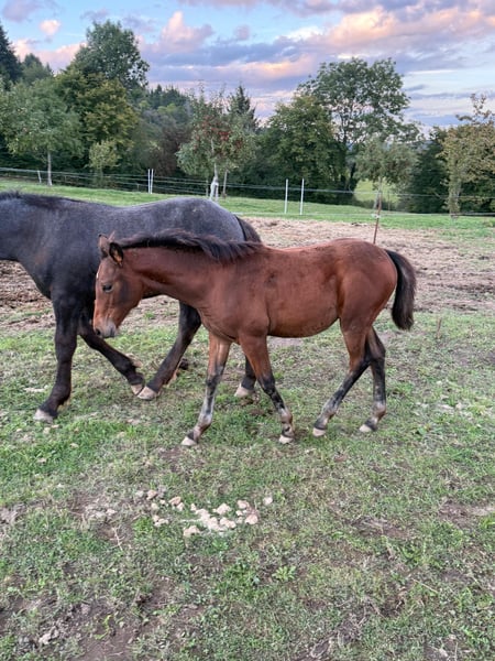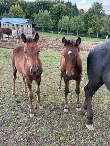 For sale is a lovely Quarter Horse cross filly born on May 22, 2025. Her sire is a successful show Quarter Horse stallion, "USS Whiz" (a direct descendant of Topsail Whiz). She can be viewed at our premises. The dam is an Appaloosa pony mare. She is already quite well-built and demonstrates good movement. She is expected to reach approximately 148/150 cm at shoulder height, as she is already of a good size for her age. She is kept in a natural herd environment with many other foals, receives high-quality feed, and is well cared for. We are also offering the dam, who is currently pregnant again by USS Whiz, for sale. No illnesses or allergies are known. An ultrasound examination (AKU) can be arranged upon request. Please feel free to call or send a message to 0157 36803742. All information is provided without guarantee. Price may be subject to change. Transport is possible. Online purchase options available.