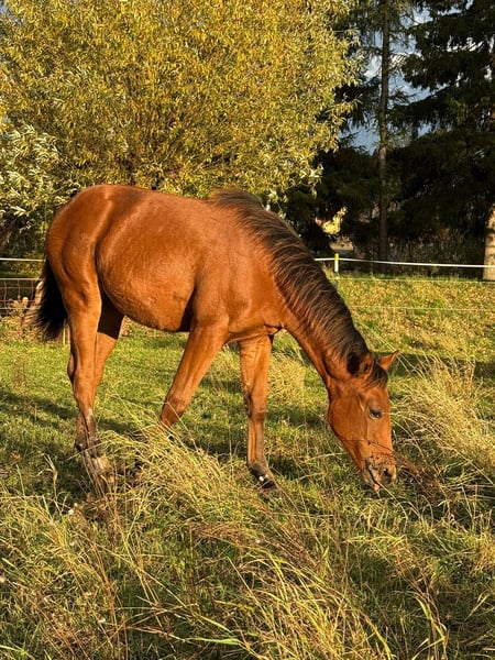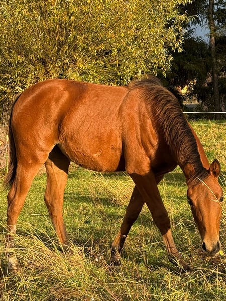 MD Pretty Miss Dunit – przepiękna klacz Quarter Horse/Paint Horse, urodzona 11 marca 2025 roku. Prezentuje się w eleganckim kolorze bay (kasztanowatym) i przewiduje się, że osiągnie końcową wysokość około 150 cm. Margie jest podwójnie zarejestrowana w AQHA i APHA, jej dokumenty są już dostępne. Na prestiżowej wystawie foal w Könnern otrzymała wysoką ocenę 8,10 jako klacz z najlepszymi ocenami, zdobywając tytuł 1a Premium Foal i zajmując drugie miejsce w swojej klasie. Spośród 18 źrebiąt została również oceniona jako drugie najlepsze na całej wystawie – co świadczy o jej wysokiej jakości i dużym potencjale. Ta młoda klacz wyróżnia się bardzo poprawną budową, harmonijną muskulaturą i doskonałym rozwojem. Jest w pełni zdrowa, regularnie odrobaczana, odpowiednio zaszczepiona i zna zarówno weterynarza, jak i kowala. Pod względem genetycznym jest w pełni zabezpieczona – testy 7-panel n/n oraz LWO i Splashed White n/n dają pewność o jej zdrowej linii. Szczególnie wyróżniają się jej częściowo niebieskie oczy, które nadają jej wyjątkowo piękny i wyrazisty wygląd. Margie dorasta w naturalnych warunkach w stadzie i korzysta z całodziennego wypasu. Otrzymuje wysokiej jakości pokarm, dostosowany do rozwoju ścięgien, stawów i kości. W codziennym kontakcie jest przyjazna, posłuszna i spokojna. Jest czujna, chętna do nauki i bardzo szybko przyswaja nowe umiejętności. Opanowała już podstawy obsługi halterem, jest nauczona podstawowych rutyn i zna podstawowe zachowania. Jej pochodzenie również nie budzi wątpliwości: pochodzi z wyśmienitej linii reiningowej i jest uprawniona do startów w DQHA Futurity. W jej papierach widnieją jeszcze Colonels Smoking Gun, Remenic N Dunit oraz Arc Sparkle Surprise. Jej atletyczne podstawowe chody i gotowość do pracy już teraz wskazują, że jest doskonała zarówno do sportu, jak i dla ambitnego jeźdźca rekreacyjnego. Niezależnie od tego, czy ma być przyszłym koniem pokazowym, czy wiernym partnerem na co dzień – MD Pretty Miss Dunit łączy poprawną budowę, sportowy potencjał i złoty charakter. Szukamy dla tej wyjątkowej młodej damy kochającego, 5-gwiazdkowego domu, z możliwością dalszego rozwoju jej talentu sportowego. Jest gotowa do natychmiastowego przeprowadzki do nowego domu i dalszej drogi z ludźmi, którzy docenią jej jakość. NRHA Germany, PHCG Futurity oraz udział w programie EWU dla młodych koni są już opłacone.