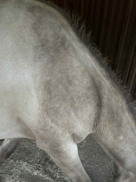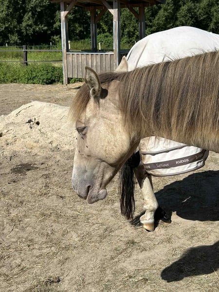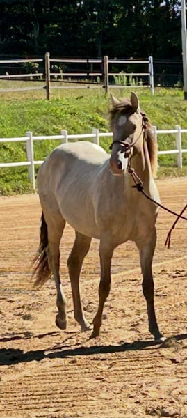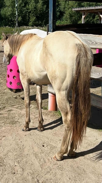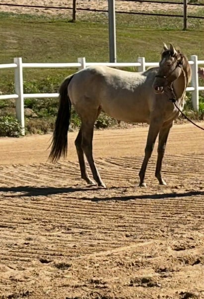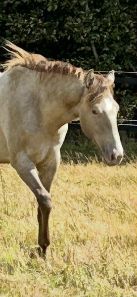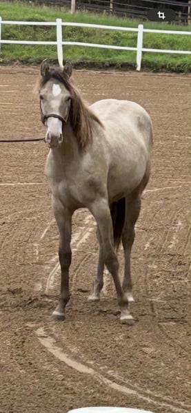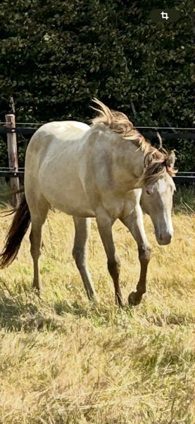 Cheyennes Marie Vudu - eine bildhübsche Quarter Horse Stute, geboren am 17. April 2024. Sie trägt die außergewöhnliche und seltene Farbe Classic Dun Champagne und ist laut Farbtest homozygot black - ein spannendes Merkmal, das sie auch für die Zucht interessant macht. Ihr voraussichtliches Endmaß liegt bei ca. 151 cm. Sie ist korrekt gebaut, gut entwickelt und bereits altersgemäß muskulös. Eine kleine AKU aus dem Jahr 2024 liegt vor - gesundheitlich ist sie unauffällig, regelmäßig entwurmt, geimpft und zeigt sich beim Tierarzt sowie Hufschmied brav und unkompliziert. Vudu wächst artgerecht auf, kennt Offenstall- und Boxenhaltung und lebt aktuell mit drei anderen Stuten in einer harmonischen Gruppe. Sie ordnet sich sozial gut ein und ist eher rangniedrig. Vom Wesen her ist sie sehr menschenbezogen, freundlich und aufgeschlossen. Sie begegnet neuen Situationen neugierig und interessiert, ist brav im täglichen Umgang, gut halfterführig und beherrscht das Fohlen-1x1 zuverlässig. Sie bringt eine positive Ausstrahlung mit, zeigt sich lernwillig und aufmerksam - beste Voraussetzungen für eine solide weitere Ausbildung. Dank ihrer guten Allround-Abstammung eignet sie sich ideal als zukünftiges Reitpferd für Freizeit oder Turnier. Vudu vereint Ausstrahlung, Interieur und Exterieur - und ist damit ein vielversprechendes Nachwuchspferd mit einem tollen Fundament für die Zukunft.