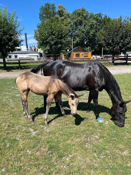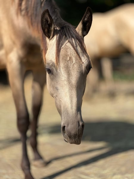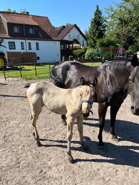 Bärbel – 1-jährige Quarter Horse Stute in Dark Buckskin mit Top-Abstammung. Ein echter Hingucker mit Charme, Ausstrahlung und Qualität! Unsere Bärbel ist eine bildschöne, dunkel buckskinfarbene Jungstute mit dem gewissen Etwas. Schon jetzt zeigt sie, was in ihr steckt – eine Traummaus mit Ausdruck, harmonischem Körperbau und klarem, freundlichen Charakter. ✅ Alter: 1 Jahr ✅ Farbe: Dark Buckskin ✅ Rasse: Quarter Horse ✅ Abstammung: Vater: SR Hollywood Dundee (Hollywood Dun It-Linie) Mutter: SR Reminics Melinda (Reminic gezogen) Mit ihrer exzellenten Abstammung vereint Bärbel bewährte Reining-Genetik – Hollywood Dun It trifft auf Reminic – und bringt damit alles mit, was man sich für Sport, Show oder Zucht wünscht. Sie wächst artgerecht auf, ist halfterführig, neugierig und menschenbezogen. Egal ob du einen zukünftigen Sportpartner, ein Zuchtjuwel oder einfach ein Pferd mit Ausstrahlung suchst – Bärbel zieht alle Blicke auf sich! Bei Interesse und für weitere Informationen freuen wir uns auf Ihre Kontaktaufnahme.