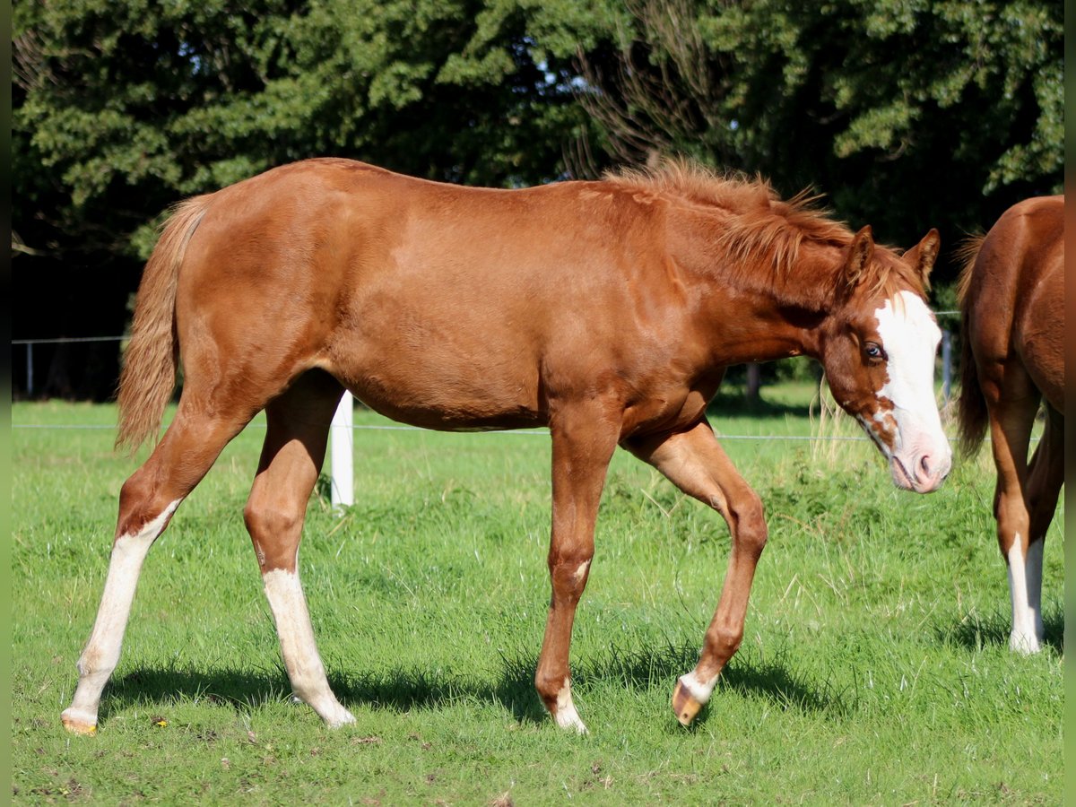 Custom Splash, geboren am 19.03.2025 mit einem Endmaß von ca. 150-153 cm, ist eine außergewöhnliche Sorrel Splash Quarter Horse Stute, die sofort ins Auge fällt. Mit ihrem markanten, ausdrucksstarken Gesicht, dem auffälligen blauen Auge links und dem partiell blauen Auge rechts sowie ihrer Fellzeichnung zieht sie alle Blicke auf sich - ein echtes Pferd, das im Gedächtnis bleibt. Ihr großrahmiger, moderner Körperbau, die perfekte Bemuskelung und die harmonische Balance spiegeln ihre natürliche Athletik und Leistungsbereitschaft wider. Sie zeigt von Natur aus Talent für Reining: elegante Körperkontrolle, eine angenehme Selbsthaltung und bemerkenswerte Balance machen sie zu einem vielversprechenden Prospect für ambitionierte Reiter (Non Pro und Open). Doch nicht nur ihr äußerer Auftritt und ihr Potenzial machen sie besonders - Custom Splash überzeugt auch durch ihren Charakter. Sie ist neugierig, aufgeschlossen und sehr menschenbezogen. Ruhig, entspannt und verschmust geht sie auf Menschen zu und lernt schnell Neues. Halfterführig, vertraut mit dem Fohlen-ABC, an Hufegeben, Putzen, Tierarzt- und Hufschmiedbesuche gewöhnt, zeigt sie von Anfang an ein vorbildliches Verhalten. Aufgewachsen im Herdenverband, kennt sie sowohl Box- als auch Offenstallhaltung und erhält eine ausgewogene Fütterung mit Aufzuchts- und Mineralfutter. 5-Panel und Mhym n/n. Sie ist NRHA Germany SSP eingezahlt. Custom Splash ist nicht nur ein Pferd mit herausragendem Reining-Potenzial, sondern auch ein echter Eyecatcher mit erstklassiger Abstammung (Custom Crome x Gunners Last Oak). Sie ist die Stute, die im heutigen Reining-Sport gefragt ist, und bietet sowohl ambitionierten Reitern als auch Züchtern die perfekte Kombination aus Leistung, Ausstrahlung und großrahmigem Typ. Die Abgabe erfolgt direkt vom Züchter - hier wartet ein einmaliges Pferd, das sowohl im Sport, in der Zucht oder als Freizeitpartner begeistern wird. Preis inkl. USt. absetzbar.