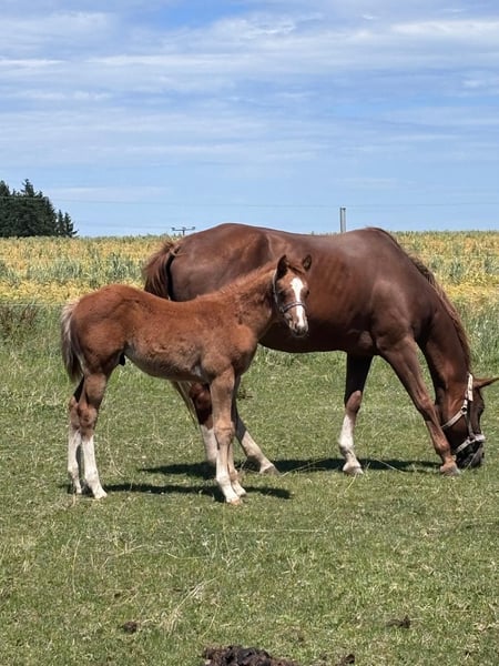 Hot Nite Invitation - ein bildhübscher Quarter Horse Hengst, geboren am 13. März 2025. Mit seiner eleganten sorrel-Farbe, seinem korrekten Gebäude und der harmonischen Bemuskelung ist er ein echter Blickfang. Er wird voraussichtlich ein Endmaß von etwa 160 cm erreichen und damit später auch größere Reiter gut abdecken können. Seine AQHA-Papiere liegen bereits vor. Dieser junge Hengst wächst artgerecht im Herdenverband auf und kennt sowohl Paddock-Box als auch Weide. Er ist altersentsprechend geimpft, regelmäßig entwurmt und an Tierarzt sowie Hufschmied gewöhnt. Hot Nite Invitation zeigt sich stets brav, ruhig und gelassen, dabei aber aufmerksam, lernfreudig und charakterstark. Sein menschenbezogener, lieber Charakter macht den täglichen Umgang mit Rocky zu einer Freude. Auch unter Bewegungsaspekten weiß dieser Youngster zu überzeugen: Er zeigt bereits jetzt schöne, taktreine Grundgangarten und bringt das Potenzial für eine erfolgreiche Laufbahn im Sport oder auf Turnieren mit. Dank seiner erstklassigen Pleasure- und Allround-Abstammung (Hotroddin Invitation x Nite Chip) eignet er sich ebenso hervorragend als zuverlässiger Freizeitpartner. Hot Nite Invitation ist DQHA Futurity startberechtigt, kennt das Fohlen-ABC und ist selbstverständlich halfterführig. Mit seinem hervorragenden Exterieur, seinem angenehmen Wesen und seinem vielseitigen Talent ist er ein echtes Versprechen für die Zukunft - ganz gleich, ob als Showpferd oder treuer Freizeitkamerad.
