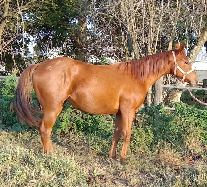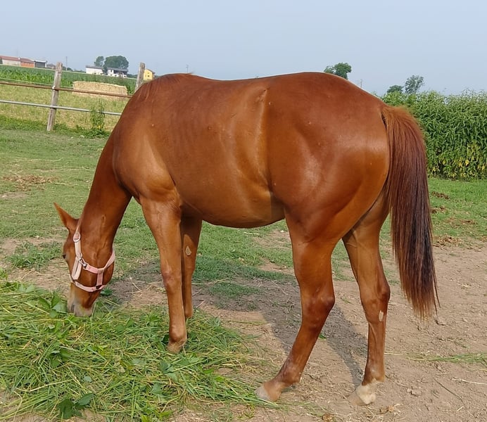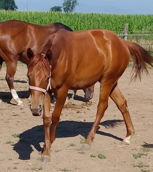 Offriamo in vendita una splendida puledra Quarter Horse di 18 mesi, figlia dell’eccellente stallone Colonels Dancing Gun, discendente diretto di Colonels Smoking Gun "Gunner", uno dei riproduttori più influenti nel mondo del reining. 🔹 Nome: Bambola Dancingun 🔹 Razza: Quarter Horse 🔹 Età: 18 mesi 🔹 Sesso: Femmina 🔹 Origini: Figlia di Colonels Dancing Gun – stallone riconosciuto, performante nel reining, con progenie nota per il suo carattere equilibrato, facilità di apprendimento e conformazione armoniosa. 🔹 Temperamento: Molto dolce, curiosa e tranquilla. 🔹 Vita sociale: Cresciuta in branco, favorendo un carattere sereno e ben equilibrato. 🔹 Manipolazione: Abituata alla manipolazione quotidiana, anche in presenza di adulti e bambini. Ideale come cavalla da famiglia o da svago, con buon potenziale per lo sport. 🔹 Salute: Ottima. Visita veterinaria completa e radiografie disponibili. Questa giovane cavalla possiede tutte le qualità desiderate: un carattere d’oro, ottime origini e una base sana per una carriera sportiva o ricreativa. Saprà evolversi positivamente tra mani esperte, sia per lavoro a terra, reining o altre discipline western. Visibile a Cuneo (Piemonte, Italia).