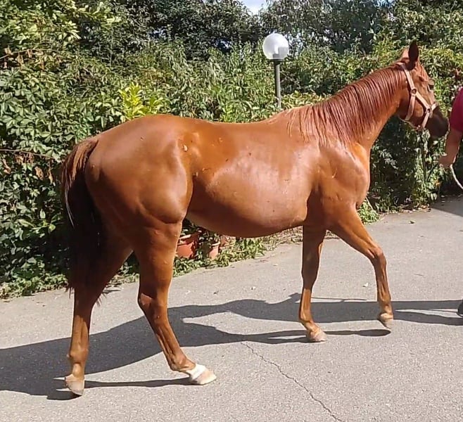 Nous proposons à la vente une magnifique pouliche Quarter Horse de 18 mois, issue de l’excellent étalon Colonels Dancing Gun, descendant direct de Colonels Smoking Gun "Gunner", l’un des reproducteurs les plus influents du reining mondial. 🔹 Nom : Bambola Dancingun 🔹 Race : Quarter Horse 🔹 Âge : 18 mois 🔹 Sexe : Femelle 🔹 Origines : Fille de Colonels Dancing Gun – reproducteur reconnu, performant en reining, dont la descendance se distingue par son mental équilibré, sa facilité d’apprentissage et sa morphologie harmonieuse. 🔹 Tempérament : Très douce, curieuse et calme. 🔹 Vie sociale : Élevée en horde, ce qui a favorisé un caractère serein et bien équilibré. 🔹 Manipulation : Habituée à être manipulée au quotidien, y compris en présence d’adultes et d’enfants. Idéale pour un futur cheval de famille ou de loisir avec un bon potentiel pour le sport. 🔹 Santé : Excellente. Visite vétérinaire complète et radios disponibles. Cette jeune jument présente toutes les qualités recherchées : un mental en or, de belles origines et une base saine pour une carrière sportive ou de loisir. Elle saura évoluer positivement entre de bonnes mains, que ce soit pour du travail à pied, du reining ou d’autres disciplines western. Visible à Cuneo, (piedmont, Italie)