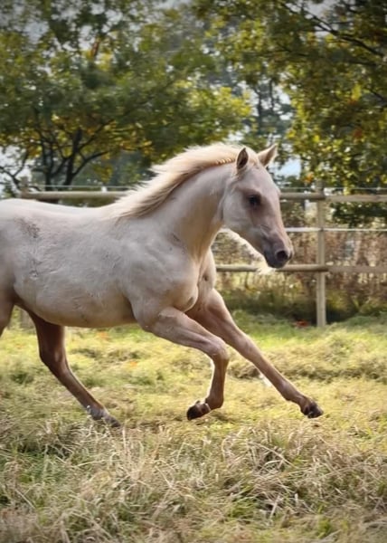 Im Not Ruf At All ist eine bildhübsche Quarter Horse Stute, geboren am 15.04.2024, in der attraktiven Farbe Palomino und mit einem zu erwartenden Endmaß von etwa 150 cm. Sie überzeugt durch ihr korrektes, kompaktes Gebäude, ihre harmonischen Proportionen sowie ihre gesunde Entwicklung. Über die Eltern ist sie 5-Panel n/n. Die Stute ist altersgemäß entwurmt und geimpft und wächst artgerecht in einer Stutenherde mit viel Bewegung und Sozialkontakt auf; aktuell steht sie in einer Gruppenbox mit Auslauf und darf unter besten Bedingungen in Ruhe groß werden. Charakterlich zeigt sich Im Not Ruf At All äußerst lieb, menschenbezogen und aufgeschlossen. Sie ist ruhig, interessiert, lernwillig und dabei immer artig und unkompliziert. Im Umgang präsentiert sie sich kooperativ und verspielt. Das Fohlen-1x1 beherrscht sie sicher: Sie ist halfterführig, kennt Hufegeben, Hängerfahrten, Putzen und zeigt sich in jeder Hinsicht unproblematisch. Ihre Abstammung lässt keine Wünsche offen: Sie stammt aus einer top gezogenen Stutenfamilie mit Schwerpunkt Reining, beide Eltern wurden erfolgreich geshowt. Ihr Vater ist der erfolgreich geshowte Not Ruf At All, der in den USA steht. Ihre Mutter ist eine sehr korrekte DQHA Elitestute von Jac O Rima und Reining High Point Horse. Damit ist sie eine hervorragende Nachwuchsstute mit vielseitigem Potenzial für Sport, Show oder eine anspruchsvolle Freizeitgestaltung und die Möglichkeit sie ggf. auch in der Zucht zu verwenden - eine vielversprechende junge Dame mit Köpfchen und Style. Die Abgabe erfolgt direkt vom Züchter.