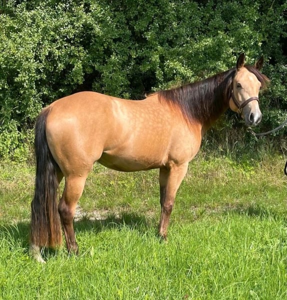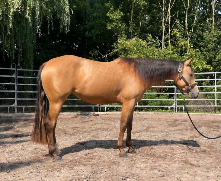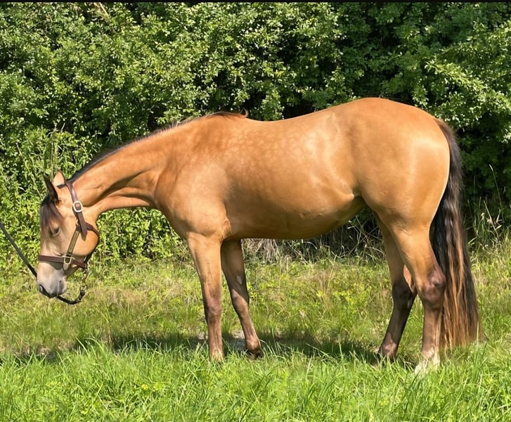 Bildhübsche Quarter Horse Stute mit bestem Reiningblut in Sonderfarbe Buckskin. Baty stammt aus eigener Nachzucht und sucht nun ein gutes neues Zuhause. Aktuelles Stockmaß ca. 148 cm. Baty ist äußerst liebenswert und talentiert. Sie wurde schonend gestartet, läuft alle Grundgangarten sicher unter dem Reiter und besitzt eine solide Grundausbildung. Sie zeigt schöne Bewegungen und ist sicher auch interessant für die Ranchridingklassen. Baty wurde regelmäßig entwurmt, geimpft und ist schmiede- und verladefromm. Sie ist im EWU Jungpferdeprogramm eingezahlt. Beide Eltern 5 Paneltest n/n. Sie wuchs artgerecht im Herdenverband auf und ist im Handling äußerst umgänglich. Röntgenbilder vorhanden, Preis der Qualität entsprechend.