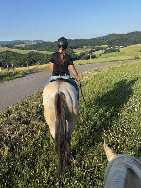 Mare Ideal for Trail Riding We are looking for the perfect partner for our very tall mare (approximately 1.58 m). She is currently being ridden in the field by my 18-year-old daughter and is comfortable with walking, trotting, and cantering—though not perfectly, but professional training would be the next step. She absolutely loves being out on trails and is perfectly suited for long-distance riding. There isn't much more we can say at this point. We initially considered sending her for training, but she was too tall and was quite overweight at the time. She has very smooth and expressive gaits. She is quite dominant but friendly. She is vaccinated, very well-behaved at the blacksmith, barefoot, and regularly dewormed. We originally bought her for my husband, but he needs a more experienced horse, and a young horse was not the right choice. She lives in a herd with eight other horses and gets along very well. She is kept in an open stable.