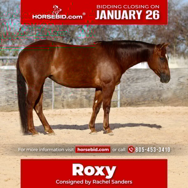 𝐉𝐀𝐍𝐔𝐀𝐑𝐘 ⭐️𝑨𝒍𝒍 𝑺𝒕𝒂𝒓 𝑳𝒊𝒏𝒆𝒖𝒑⭐️ Happening now thru MONDAY | JANUARY 26th - Available EXCLUSIVELY on HorseBid's website! For more details and to register visit: www.Horsebid.com CONSIGNOR CONTACT: Rachel Sanders 805-453-3410 LOCATION: Decatur, TX BREED: Quarter Horse REGISTERED: Yes REGISTERED NAME: Miss Scarlet N Gray COLOR: Sorrel HEIGHT: 14.1 AGE: 4 GENDER: Mare Meet Roxy, a gorgeous 4-year-old mare by Dun It For Whiskey and out of Miss Scarlet In Chex. Roxy has been successfully shown in reining and is already an NRHA money earner, showcasing her talent and potential. She’s absolutely sound, gentle, and equipped with all the fancy buttons you could ask for. With her great disposition and wonderful personality, Roxy is a joy to work with. She’s 100% sound and sane in every way, making her an ideal addition to any barn. She is She is by Dun It For Whizkey (LTE $269,530) his offspring have been super successful earning $746,414 in their show careers. She is out of Miss Scarlet Chex (LTE $12,674) and has produced some awesome babies. Roxy would be an outstanding addition to anyone’s program, show her now and breed her later! Don’t miss out on this exceptional mare!