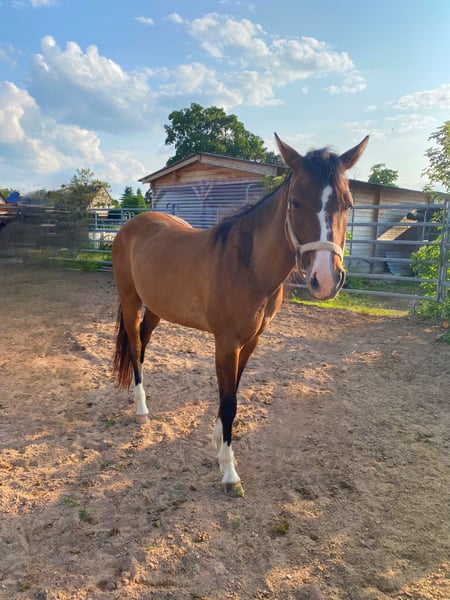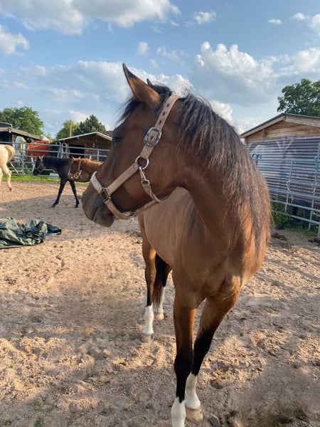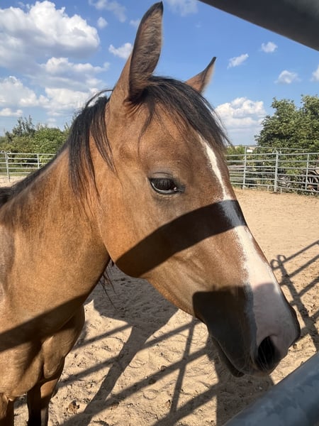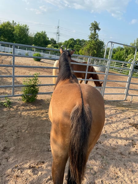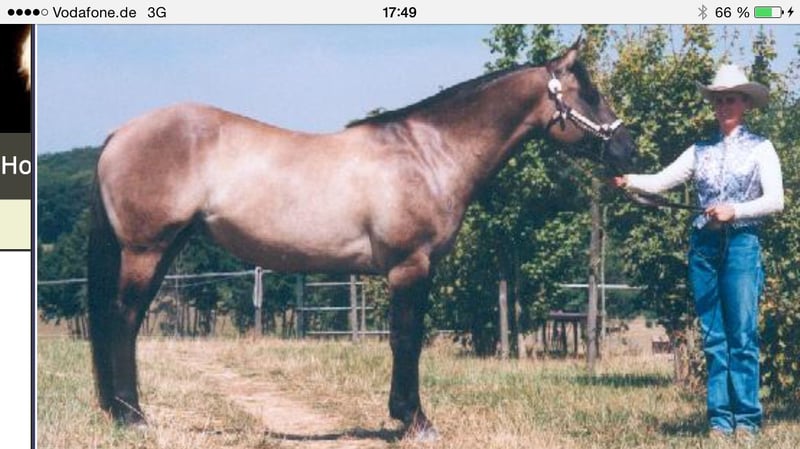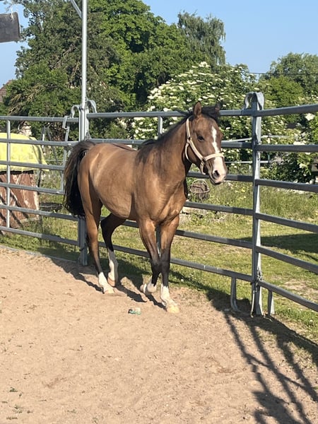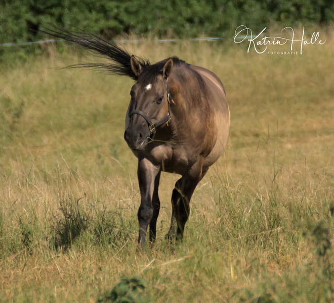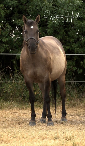 **Verkaufsanzeige: American Quarter Horse Stute** Zum Verkauf steht eine vielversprechende American Quarter Horse Stute, die im Jahr 2022 geboren wurde. Diese junge Dame besticht durch ihre außergewöhnliche Dun -Färbung und hat bereits mal ein Stockmaß von 150 cm. Sie ist bestens für den Westernreitsport geeignet und zeigt großes Potenzial in dieser Disziplin. Mit ihrem sanften Wesen und ihrer Lernbereitschaft ist sie sowohl für ambitionierte Freizeitreiter als auch für den Turniersport eine hervorragende Wahl. Diese Stute bringt alle Voraussetzungen mit, um ein zuverlässiger Partner im Sattel zu werden. Sie ist gesund, gut erzogen und bereit, mit ihrem neuen Besitzer durchzustarten. Bei Interesse freuen wir uns auf Ihre Nachricht, um weitere Details zu besprechen oder einen Besichtigungstermin zu vereinbaren.