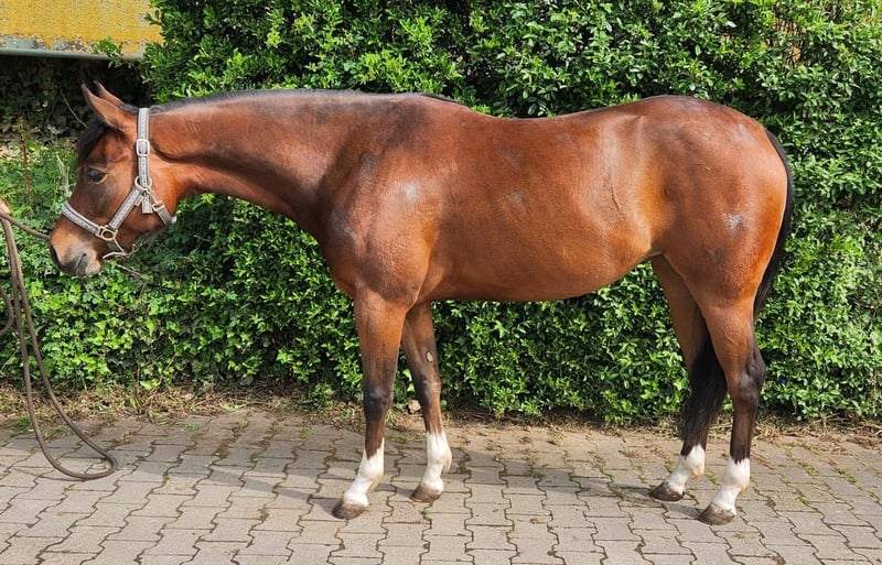 Sure A Magic Cielo ist eine bildhübsche, ausdrucksstarke Quarter Horse Stute, geboren am 27.04.2022, mit AQHA-Papieren und Equidenpass. Sie präsentiert sich in einem harmonischen, korrekten Gebäude, ist gesund, 5-Panel n/n getestet und hat aktuell ein Stockmaß von ca. 145 cm. Die junge Stute ist bestens sozialisiert, kennt 24-Stunden-Weide, Offenstall und Paddockbox und zeigt sich im täglichen Umgang unkompliziert, aufmerksam und leicht zu händeln. Sie besitzt ein sanftes, menschenbezogenes Wesen, ist brav beim Tierarzt und Hufschmied, regelmäßig geimpft und entwurmt und kennt Hunde, Kinder, Trecker und vieles mehr. Sure A Magic Cielo bringt viel Talent und Motivation mit und lässt sich leicht ausbilden. Sie zeigt gute Bewegungen und stammt aus einer sehr guten Reining-Abstammung, was sie zu einer vielversprechenden Nachwuchsstute für den Sport macht. Heza Sure Whiz x Lena Cielo. Eingezahlt ins EWU Jungpferdeprogramm und optimal geeignet für einen ambitionierten Non Pro Reiter, bietet sie beste Voraussetzungen für eine erfolgreiche sportliche Zukunft. Nach 12 Monaten Profiberitt präsentiert sie sich als zuverlässige, anständige und lernwillige Jungstute, die nicht nur sportlich überzeugt, sondern auch als herzliche Partnerin im Alltag begeistert.