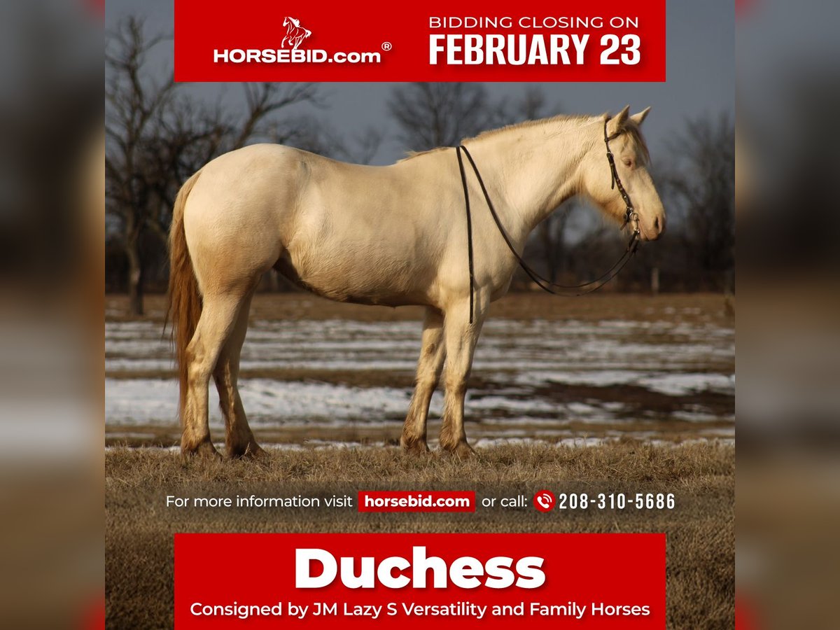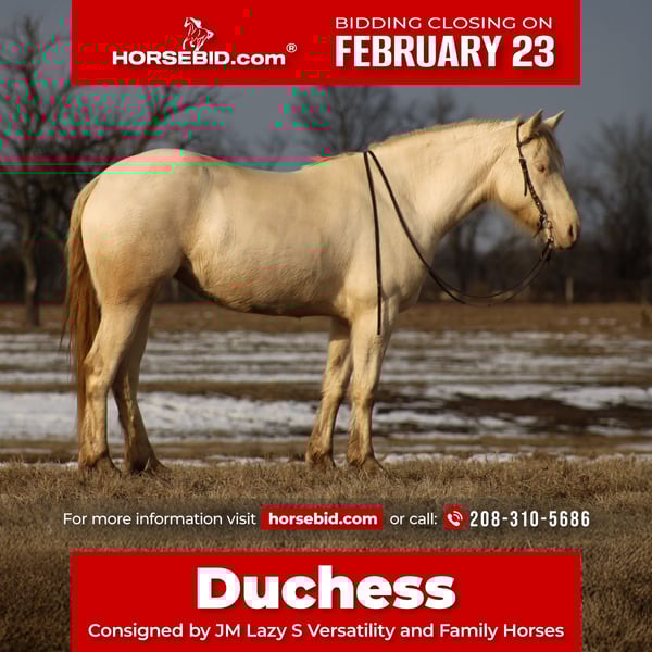 💎 𝐓𝐇𝐄 𝓓𝓲𝓪𝓶𝓸𝓷𝓭 𝐒𝐇𝐎𝐖𝐂𝐀𝐒𝐄 💎 Happening now thru MONDAY | FEBRUARY 23rd - Available EXCLUSIVELY on HorseBid's website! For more details and to register visit: www.Horsebid.com CONSIGNOR CONTACT: JM Lazy S Versatility and Family Horses 208-310-5686 LOCATION: Baxter Springs, KS BREED: 1/4 Quarter Horse 1/4 Shire 1/4 Friesian 1/4 Andalusian REGISTERED: No REGISTERED NAME: Duchess COLOR: Perlino HEIGHT: 15.1 AGE: 4 GENDER: Mare Duchess is a truly one-of-a-kind 4-year-old 15.1h perlino mare who turns heads everywhere she goes. With her rare and thoughtful blend of ¼ Quarter Horse, ¼ Shire, ¼ Friesian, and ¼ Andalusian, she combines athletic ability, substance, and elegance in a way that’s hard to find. She’s extra unique in every sense — from her striking color to her trainability and natural talent. Duchess is the kind that picks things up quickly and enjoys doing anything you can throw at her. She’s a beautiful, uphill and floaty mover with presence, yet she’s practical and handy enough to step right into ranch work. Duchess has been used for real ranch chores, including doctoring, sorting, and loading trucks. She side-passes both directions, rides one-handed or direct rein, and has a great handle. She’s confident and level-headed in busy environments and is good with pigs, goats, dogs, sleds, tarps, and flags. She’s comfortable over water, brush, and logs, and has been started over cross-country style jumps. Her demeanor is one of her best qualities — sweet, people-loving, and willing. She was home-raised and with us since she was just a baby, and her full brother is the same type, both consistently passing on their good minds and kind personalities. As a young mare with an exceptional mind and solid foundation, Duchess has her whole future ahead of her and is perfectly suited to continue on in an English program or as a trail and all around horse. She is the kind you can finish shape your way and enjoy for years to come. She is up to date on dental, chiropractic, farrier care, and worming, and is ready to go on with. If you’re looking for a versatile, eye-catching mare with brains, ability, and heart, Duchess fits the bill. Call or text John at (208) 310-5686 for more information.
