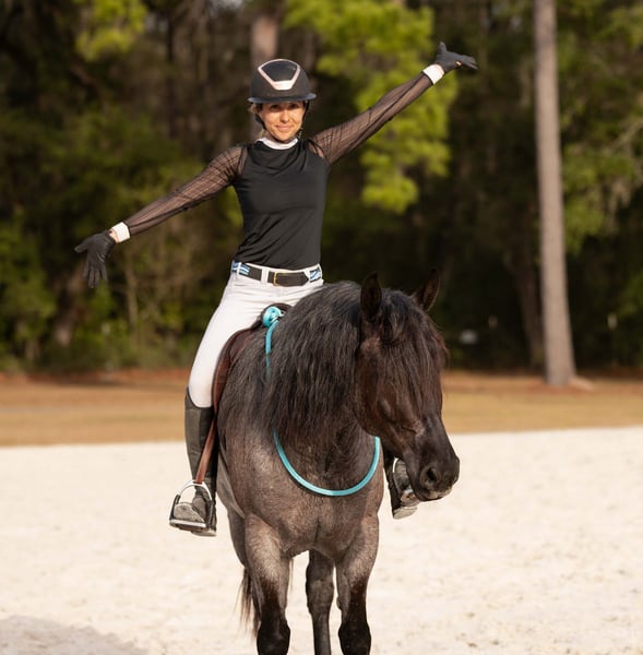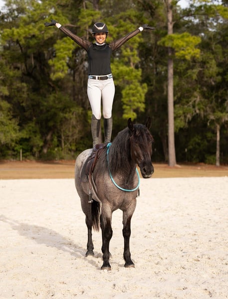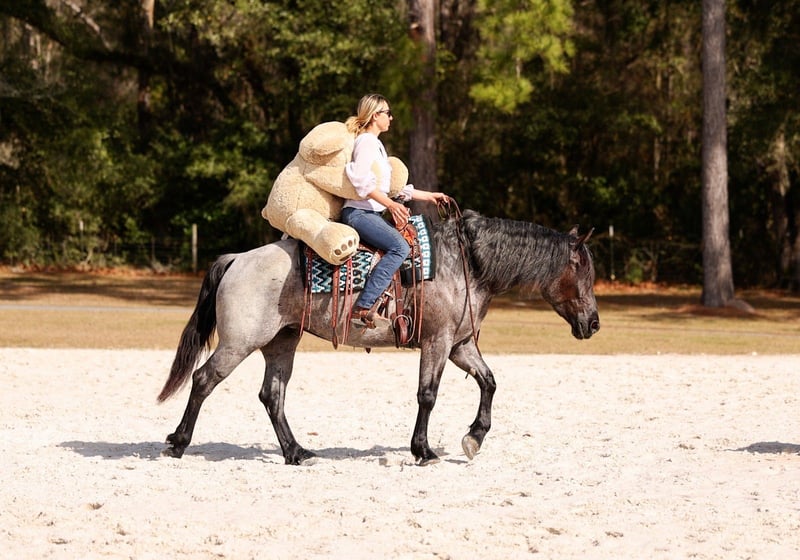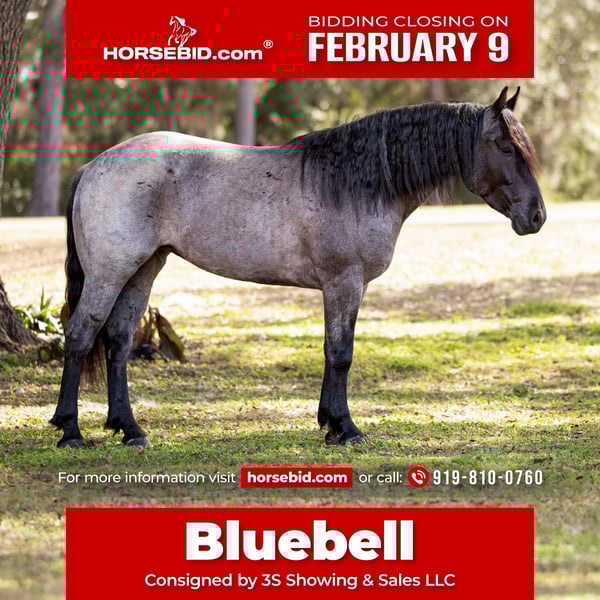 ❤️🔥𝑩𝒆 𝑴𝒊𝒏𝒆 𝐒𝐄𝐋𝐄𝐂𝐓❤️🔥 Happening now thru MONDAY | FEBRUARY 9th - Available EXCLUSIVELY on HorseBid's website! For more details and to register visit: www.Horsebid.com CONSIGNOR CONTACT: 3S Showing & Sales LLC 919-810-0760 LOCATION: Ocala FL BREED: QH/Percheron REGISTERED: No REGISTERED NAME: Bluebell COLOR: Blue Roan HEIGHT: 15.2 AGE: 4 GENDER: Mare Bluebell is a 4 year old 15.2 hand QH/Percheron cross. She is a beautiful blue roan mare with an exceptional, unflappable mind and the sweetest, most affectionate personality you could ask for! Bluebell is SAFE and FANCY. She came directly from her breeder and has been our program for the past year. She has earned what we consider “elite” status. Owning a horse of her caliber has been an absolute pleasure, and we are beyond proud to represent a horse with this much quality, heart, and character. Under English tack, Bluebell is ridden in a simple snaffle. She leg-yields beautifully, moves off the leg and has smooth balanced transitions. She turns on the haunches, picks up the canter directly from the walk, and has a perfect halt/stop with a simple “whoa.” She is adjustable, soft, brave, and incredibly willing and honest with every rider. Bluebell has been to multiple cross country facilities! She confidently goes into the water, jumps down banks AND double down banks , over coops, brush, and hedges! She is the same bold, honest horse every time. Our 8 year old rider has taken her solo around the cross country course, which truly speaks volumes about her brain and reliability. She has also been trail ridden extensively and is 100% traffic safe! Bluebell happily packed a timid adult amateur down the beach and straight into the crashing waves without hesitation. Bluebell has also completed full obstacle courses including the teeter-totter bridge, pool noodles, and more! Bluebell has been around cattle, including longhorns! She has even been ridden at night through colorful smoke bombs and around fire. In Western tack, she is just as beautiful and broke. She will stop on a dime, move out into an extended trot or settle into a slow jog, and responds beautifully to your voice. She is truly husband safe for a quiet ride. Bluebell also rides completely bridleless — walk, trot, canter, and even jump! Notice in the video that our arena has no fencing, which is a true testament to her training and rideability. She stays soft, responsive, and confident off your seat, leg, and voice alone. What truly sets Bluebell apart is her temperament. She is a total love bug! Cuddly , sweet, and a genuine people horse. She will meet you at the gate where the smallest riders can bring her in, groom, tack up, and handle her completely on their own. She stands quietly and patiently for every step. Bluebell has safely carried riders from 8 to 77 years old and is consistently my go to horse when I need to pack a child or timid adult amateur. She is kind, honest, confidence building, and trustworthy in every situation we put her in. In the barn, she is just as wonderful. Easy to load, tie, cross tie and catch. Bluebell is happy inside, turned out alone or in a mixed herd! She is barefoot & has absolutely no vices. She is an easy keeper. To sum it up, Bluebell is a thoroughly tested, family-safe horse that is also talented and trained enough for the show ring! She is suitable for the walk trot rider, yet fancy and capable enough to jump cross country, go down centerline, or step right into the show jump ring!! Family safe, kid safe, amateur safe AND beautiful with all the fun buttons. And let’s not forget — she is a head turning blue roan with presence and beauty to match her talent and brain. With Bluebell, you truly can have looks, training, versatility, and temperament. There is no reason to compromise! If you’d like to meet Bluebell, please reach out today. We have an in-house shipper who can easily arrange safe, reliable transportation anywhere in the country. Bluebell has been a very special part of our program and our family, and while we may only be a small part of her story, we are truly hoping to find her forever family.