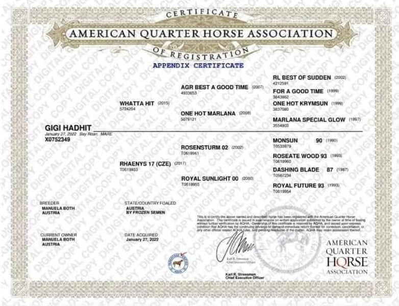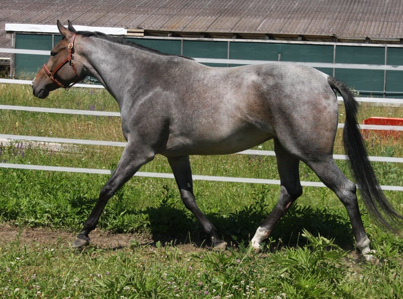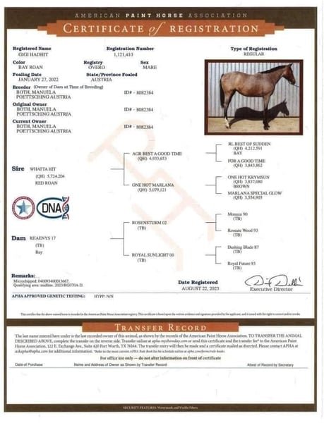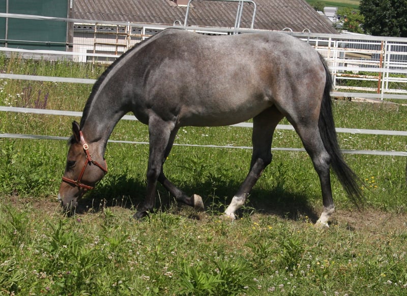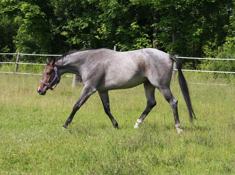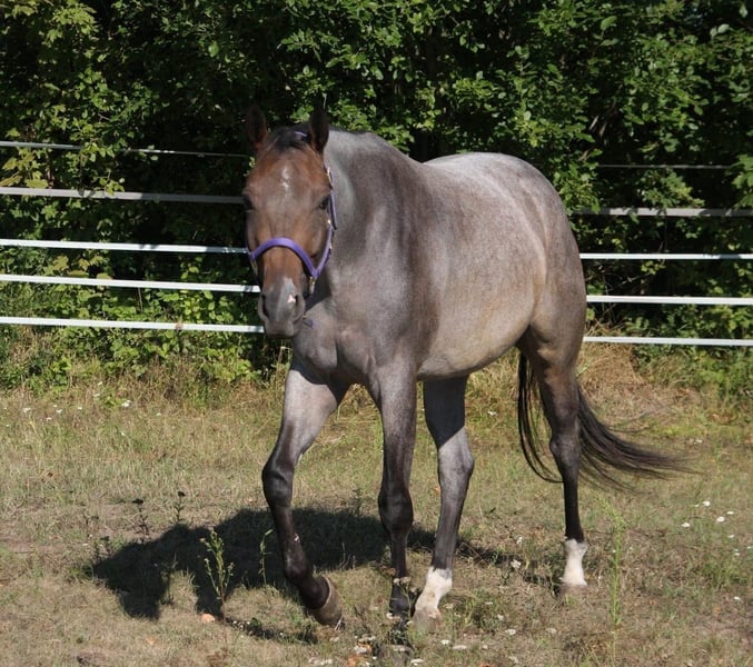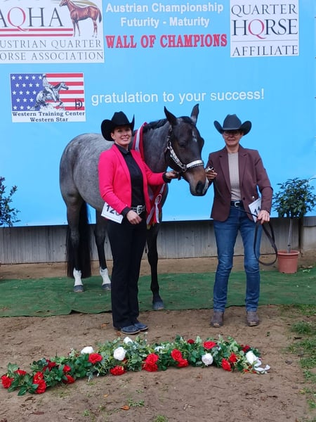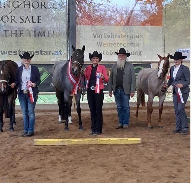 AQHA / APHA Bay Roan Hunter Under Saddle / All Around Stute Geboren 01/2022 - 5 Panel n/n über die Eltern Aktuelles Stockmaß: 1,63 Mutter: Rhaenys - Englisches Vollblut - Stockmaß: 1,67 - 5 Panel getestet und alles n/n Vater: Whatta Hit - Quarter Horse - Stockmaß: 1,60 - 8 Panel getestet und alles n/n Der Vater, sowie ihre Halbbrüder (väterlicher Seite) können ebenfalls direkt bei uns vor Ort besichtigt werden. Wir überlegen (sollte alles passen) für unsere tolle selbstbezogne Stute ein neues Zuhause zu suchen,. KEIN Notverkauf!! Sie wird jetzt nur für kurze Zeit angeboten, da wir in Kürze mit unseren Zuchtplänen für nächstes Jahr starten. Sie wird nur vorübergehend angeboten, da wir seit letztem Jahr eine eigene EU-Besamungsstation sind und unser Fokus zukünftig mehr auf den Hengsten liegt. Wie jedoch bereits erwähnt, handelt es sich absolut um keinen Notverkauf!! „Gigi“ ist aktuell 1,63 groß. Hat gerade Beine, einen kurzen Rücken und ein harmonisches Gesamtbild. Sie hat eine tolle Bewegung und ist sehr fein im Umgang. Sie ist noch nicht angeritten, kennt aber Longe, Hänger Fahren, ist brav beim Hufschmied, lässt sich brav anbinden und hat auch schon 3x Turnierluft geschnuppert. Auf den Turnieren wurde sie immer toll bewertet und konnte schon folgende Ergebnisse mit nach Hause nehmen: Österreichische Meisterin Halter 2yo Mares Mehrfache Klassensiegerin Halter 2x Österreichische Vize Meisterin Halter Mares 2x Futurity Reserve Champion Halter Mares Reserve Grand Champion Halter Mares Sie kann in 7033 Pöttsching (Österreich) besichtigt und kennengelernt werden. Und nun zu ihrem Manko: Sie koppt gelegentlich in der Box und hat am hinteren Bein eine Narbe (welche sie nicht stört) durch eine Verletzung vom letzen Jahr. Eine Ankaufsuntersuchung kann gerne auf Kosten des Käufers durchgeführt werden. Fixpreis €10.000.- Bei ernsthaftem Interesse stehe ich jederzeit für Fragen zur Verfügung! Bitte jedoch vorher das Inserat vollständig lesen und nur bei ernsthaften Interesse Kontakt aufnehmen!