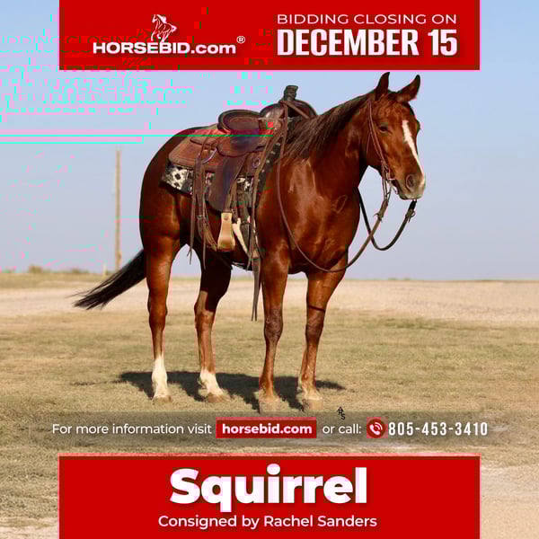 🎄𝐓𝐇𝐄 𝑯𝒐𝒍𝒊𝒅𝒂𝒚 𝐂𝐋𝐀𝐒𝐒𝐈𝐂🎄 Happening now thru MONDAY | DECEMBER 15th - Available EXCLUSIVELY on HorseBid's website! For more details and to register visit: www.Horsebid.com CONSIGNOR CONTACT: Rachel Sanders 805-453-3410 LOCATION: Decatur, TX BREED: Quarter Horse REGISTERED: Yes REGISTERED NAME: HS MY SKIRT HAS GUNS COLOR: Sorrel HEIGHT: 14.1 AGE: 4 GENDER: Mare Squirrel Meet Squirrel, your next barn favorite! This stunning 4 year old sorrel mare has the looks, talent, pedigree, and temperament to fit into any program. She’s been professionally started in both reining and ranch riding, giving her a solid foundation, excellent manners, and tons of eye appeal in the arena. Squirrel’s black type pedigree makes her stand out. She is by the NRHA 4 million dollar sire Colonels Shinning Gun and out of MYSKIRTSINTHEDIRT who earned $12,000 in the NRHA and has produced $140,000. What really sets her apart is her unbeatable disposition. She is gentle, quiet, and trustworthy for —beginners, seasoned riders, or anyone in between. Whether you’re looking for a fun weekend show partner, a dependable ranch rider, or a sweet mare to enjoy around the barn, she checks every box. Squirrel is very easy going and willing. She will do anything you ask her to do without hesitation. She is the first one to meet you at the gate and be caught. She absolutely adores cookies and affection. She’s an in your pocket type of horse making her unlike your typical mare. Squirrel is healthy and sound and ready for her next partner. She’ll make a fantastic addition to someone’s barn and is the kind of horse you’ll love having around every single day. Serious inquiries welcome—come meet her and see why everyone falls in love! 🧡🐴