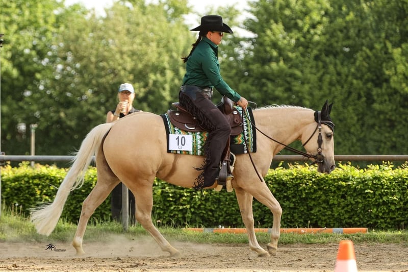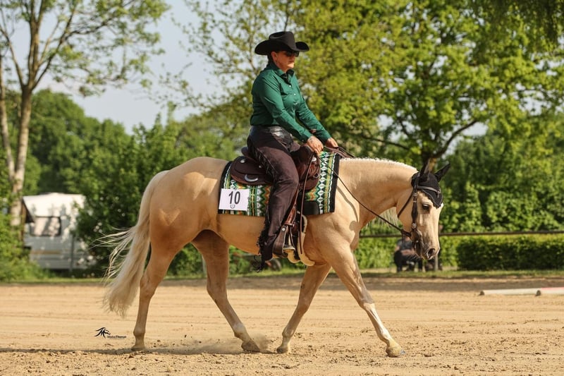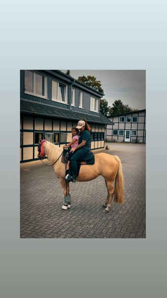 Goldie has earned her name not only because of her stunning appearance but especially because of her heart of gold! She is simply a treasure. Whether in the terrain, at competitions, or during training sessions, Goldie is always motivated and a reliable partner at just 4 years old. She has been gently backed and is easy to handle. The farrier, trailer, nothing is a problem. She is currently housed with mares and geldings. Goldie measures 1.45 m (14.1 hh) Born in 2021 Goldie is being offered together with her saddle. Her truly gentle nature makes her suitable even for novice riders. Only in the best hands, as we unfortunately have to part with her due to personal reasons.