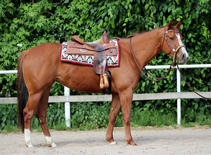 For sale is an elegant American Quarter Horse mare, born in 2021. With her striking chestnut coat, she immediately captures everyone's attention. She has a height of 15.6 hh, making her an ideal partner for Western Pleasure and recreational riding. This well-trained Quarter Horse mare impresses with her balanced temperament and reliable work ethic. She is friendly in handling, attentive, and consistently calm and cooperative both under saddle and in daily interactions. Thanks to her solid foundation in Western riding, she is perfect for riders seeking a dependable and versatile horse that performs excellently in Western Pleasure disciplines. Her athletic build combined with her friendly nature makes her an ideal companion for ambitious leisure riders or Western enthusiasts. She is healthy, regularly dewormed, and maintained in excellent condition. If you are looking for a reliable, well-rideable Quarter Horse mare that excels in Western Pleasure and recreational riding, this chestnut mare is the perfect choice. I am happy to provide further information and a personal impression.