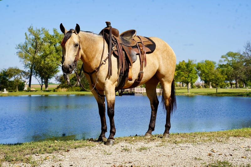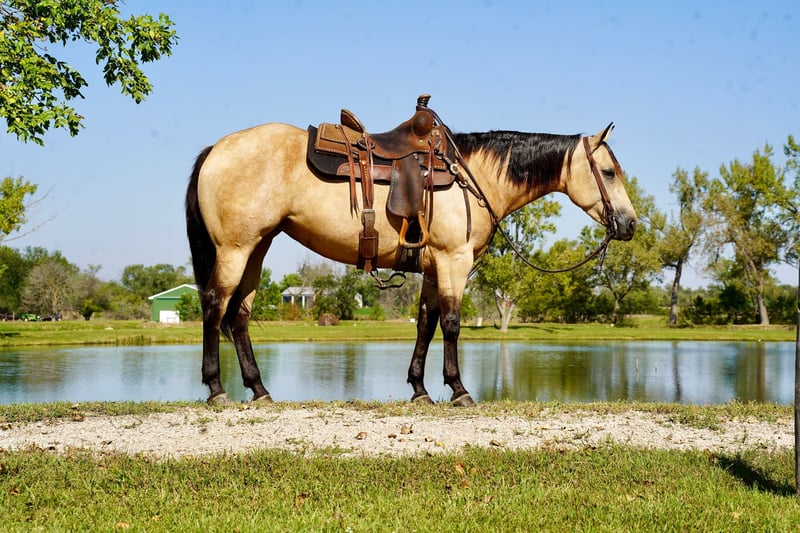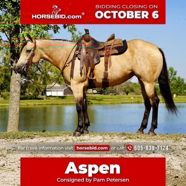 🍂 𝓐𝓾𝓽𝓾𝓶𝓷 𝑨𝑳𝑳 𝑺𝑻𝑨𝑹 𝑳𝑰𝑵𝑬𝑼𝑷 🍂 Happening now thru MONDAY | OCTOBER 6th - Available EXCLUSIVELY on HorseBid's website! For more details and to register visit: www.Horsebid.com CONSIGNOR CONTACT: Pam Petersen 605-838-7124 LOCATION: Corsica SD BREED: AQHA REGISTERED: Yes REGISTERED NAME: Zans War Sensation COLOR: Buckskin HEIGHT: 15 AGE: 4 GENDER: Mare Zans War Sensation “Aspen” is a drop dead gorgeous kind gentle mare that loves people and attention, she comes running when called, she is 4 but acts like a teenage horse she has a great handle, she sidepasses goes thru obstacle courses, rides down trails amazing, traffic safe, good in a group or alone, rides in town, down hwys, she is not spooky, we have played horse tag on her, she is very athletic and always willing, she has no buck rear kick or bite at all, she has tracked cattle, and also started on tricks will lay down and step up to mounting block or fence on cue for mounting, the kids can climb all over and under her, you can ride her with just a string around her neck, and rides bareback fantastic, she is very soft in the face and neck reins nicely, she rides extremely good in arena, walk trot lopes around like she floats, she saddles and bridles good, she is good for farrier and vet, loads and unloads great she will go on slant load and back off or good for open livestock trailer. Call or Text 605-838-7124