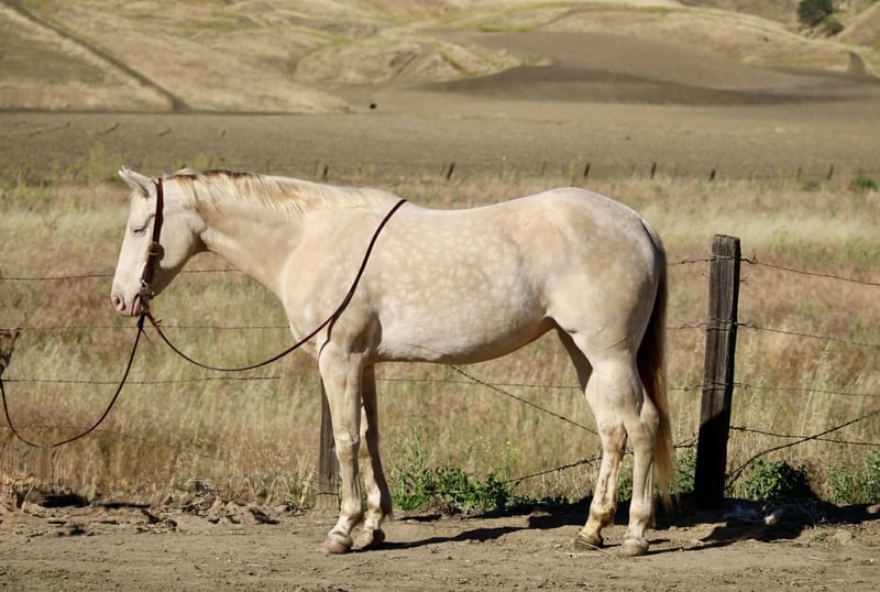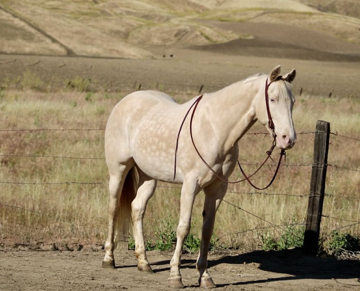"AVAILABLE ON ONLINE HORSE AUCTION AT www DOT PlatinumEquineAuction DOT com BIDDING OPEN NOW thru SUNDAY | MAY 10TH! *Final price will be determined on auction site* CONSIGNOR CONTACT INFO: Cheyenne Rey 831-537-8746 LOCATION: Bitterwater, CA Gemma is a 5-year-old perlino dappled mare with two striking blue eyes and a look that gets noticed everywhere she goes. She stands right at 15 hands and is built correctly with a balanced, athletic frame. She’s the kind of mare that’s just as pretty standing in the pasture as she is under saddle. What really makes Gemma special is her personality. She’s kind, friendly, and genuinely enjoys being around people. She’s easy to catch, meets you at the gate, and has a quiet, steady way about her. She is not marish and stays consistent in her attitude no matter the day. She’s the same horse every time you pull her out. Gemma is very smart and easy to train. She picks things up quickly and, more importantly, remembers what she learns. You can show her something once and the next time she comes back like she’s been doing it for years. She has a willing mindset and tries to do what’s asked without getting frustrated or nervous. She’s been ridden out on trails, along roads, and on the beach. She handles new things calmly and goes where she’s asked without hesitation. She doesn’t get worked up and has a steady, honest feel to her that makes her enjoyable to ride outside the arena. In the arena, Gemma is soft and naturally carries herself low-headed. She neck reins, has a solid stop, and moves off your hand and leg easily. She transitions smoothly through her walk, trot, and lope and will hold a nice, even circle. She also has a soft, easy reverse and a good foundation that you can take in any direction. On the ground, she’s just as easy. She stands tied quietly, hauls well, and is good for bathing. She’s great for the farrier and handles her feet without any fuss. Overall, she’s respectful, well-mannered, and simple to be around. Gemma is a really nice young mare with a solid start and a great mind. Whether you want a dependable trail horse or something to continue on with in a specific discipline, she’s ready to go on and do the job. She is located in Bitterwater, CA. For more information or to schedule a time to come see her please contact Cheyenne at 831-537-8746.